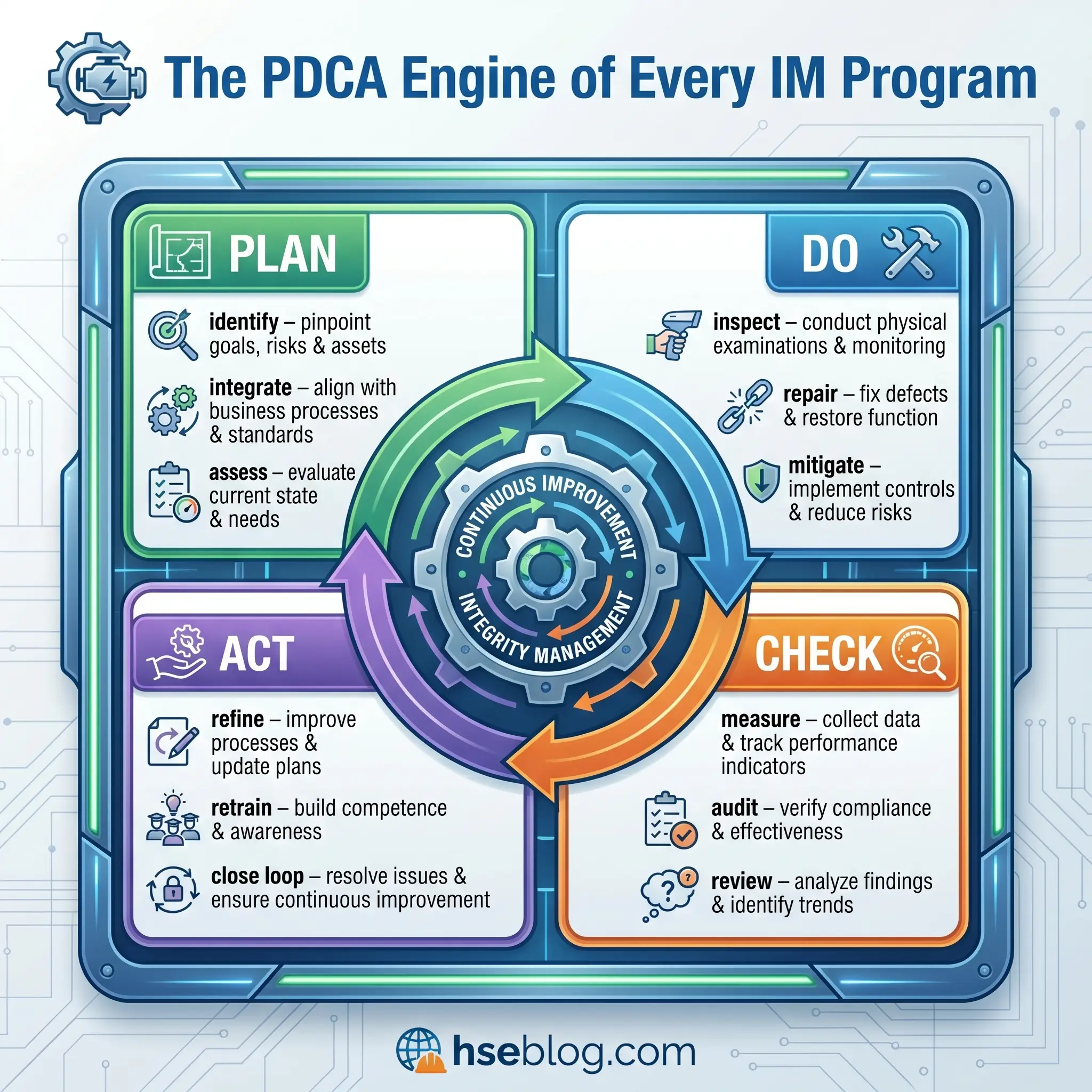 The engine that drives a program is the Plan-Do-Check-Act (PDCA) cycle. Plan identifies threats, assesses risk, and sets priorities. Do executes inspections, repairs, and preventive work. Check measures performance against defined metrics. Act closes the loop by refining thresholds and re-allocating resources based on what the program learned.