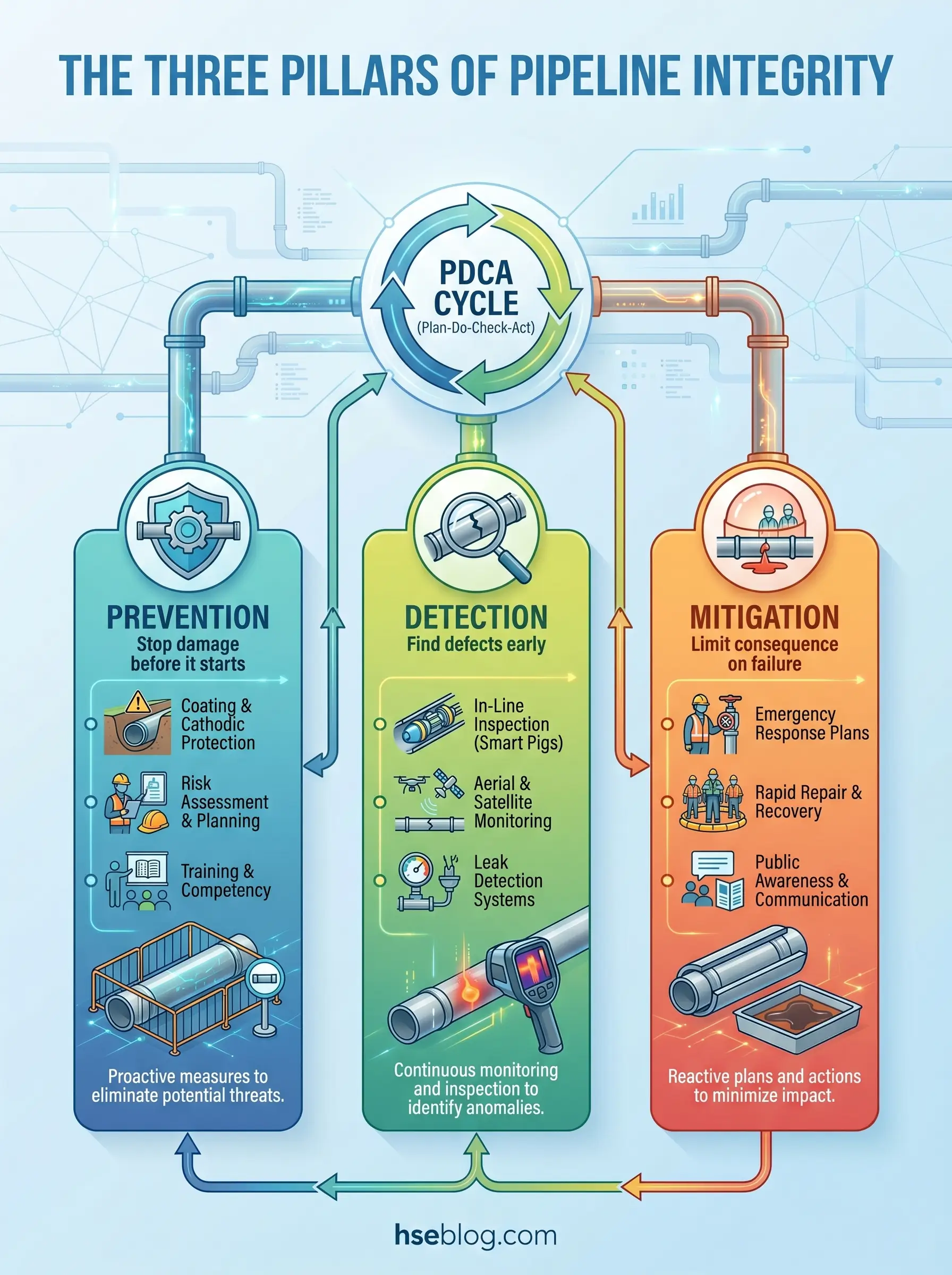 A mature Pipeline Integrity Management Program (IMP or PIMS) rests on three pillars — prevention, detection, and mitigation. Prevention keeps damage from occurring. Detection finds it early, while safety margins still exist. Mitigation limits consequence when prevention or detection falls short. Strip any one pillar and the other two collapse.