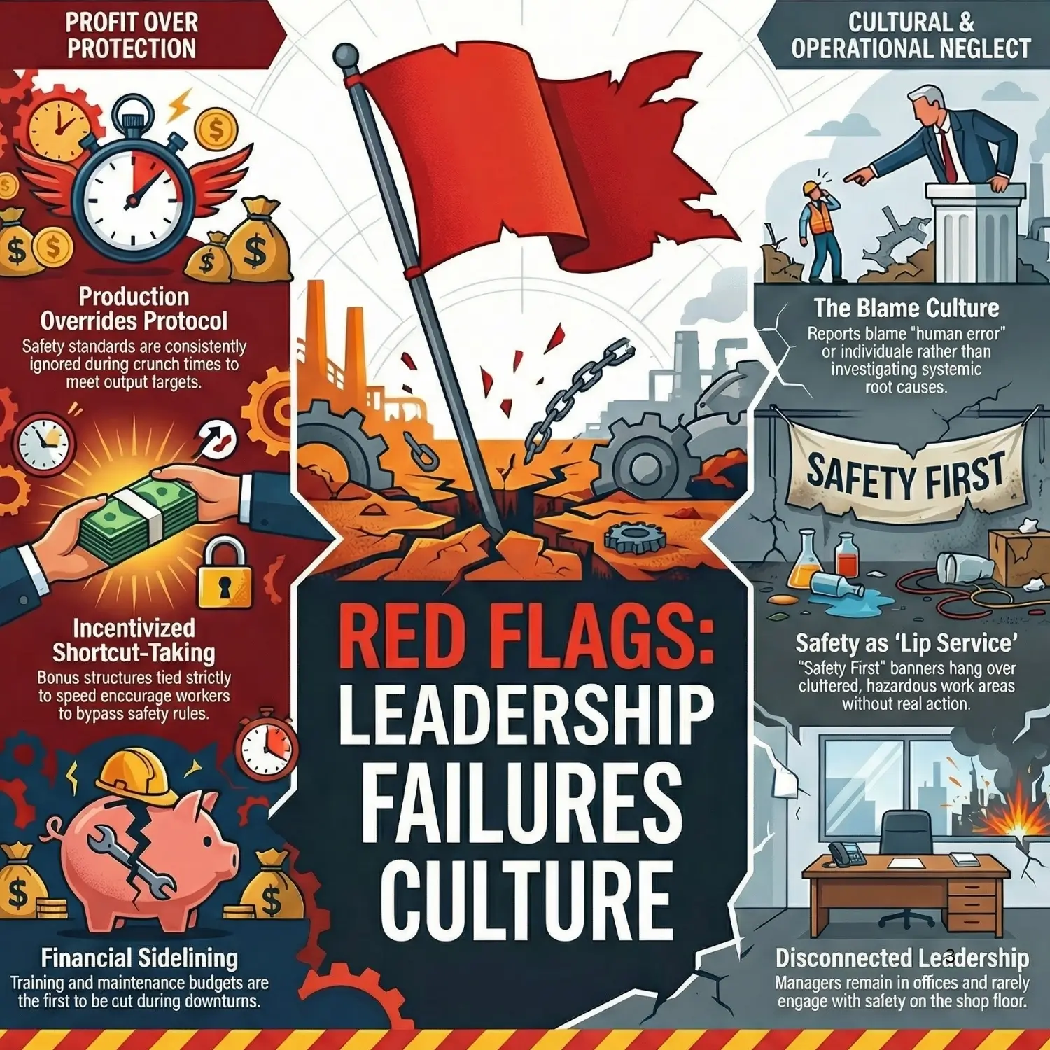 - Blame culture: Accident reports conclude with “worker reprimanded” or “human error” without digging deeper.