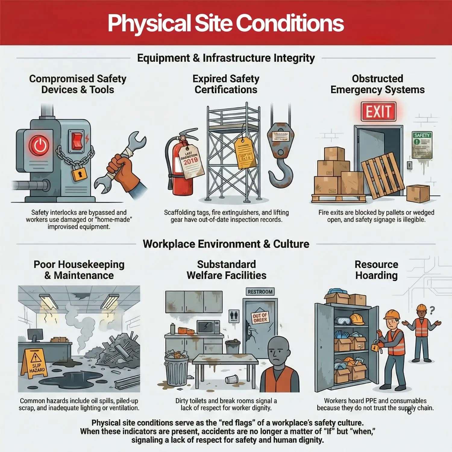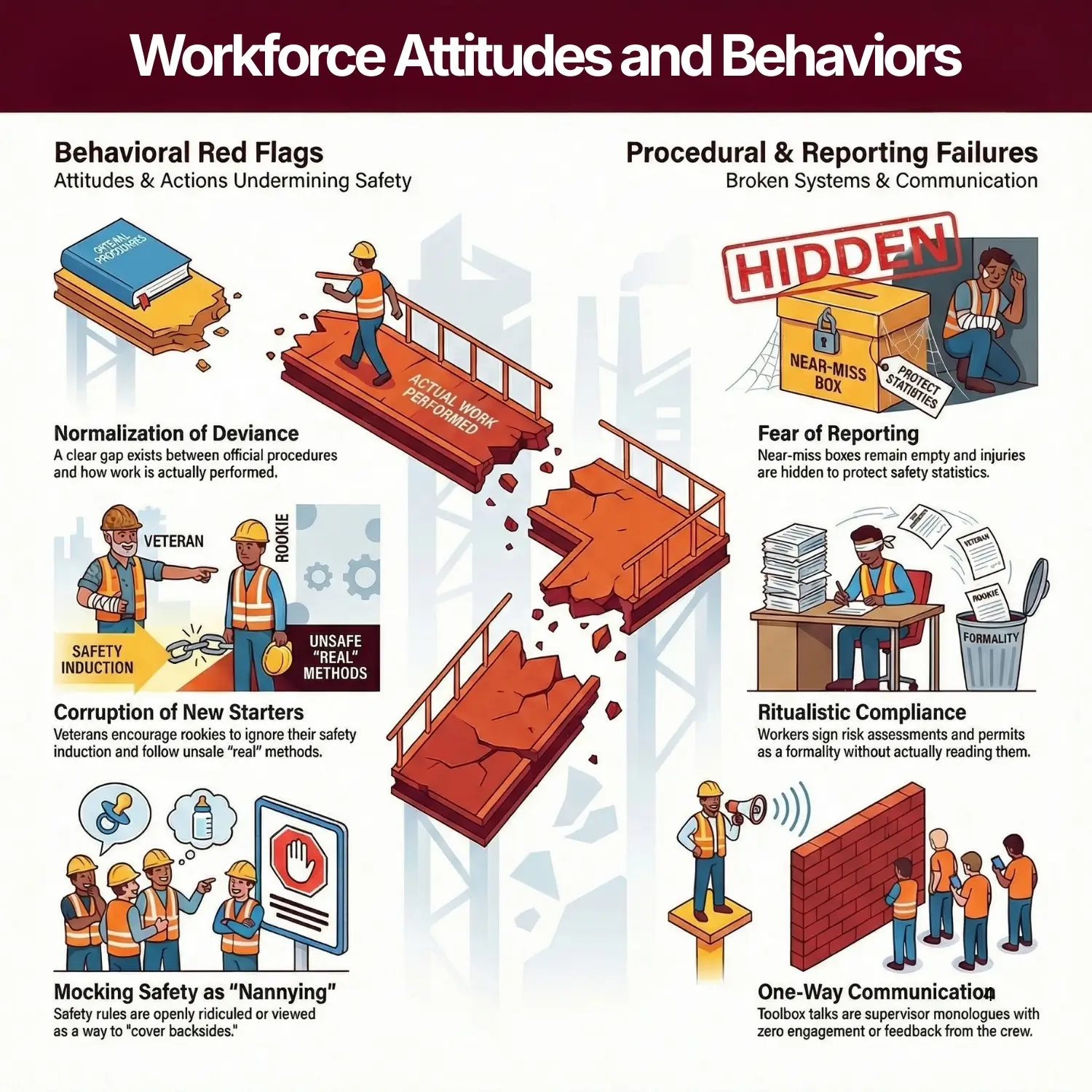 - Negative indicators are often silent: Unreported near-misses, silent safety meetings, and “clean” accident books are often signs of a suppression culture, not safety.