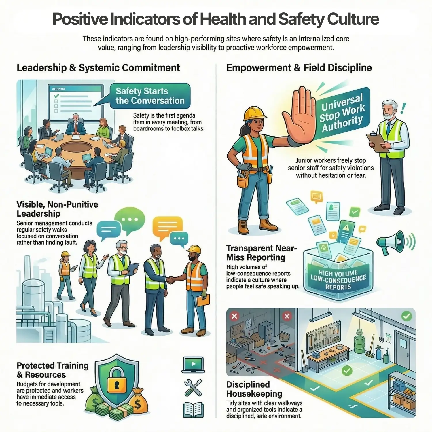 - Leaders are visible in the field: Senior management conducts regular, non-punitive safety walks, focusing on conversation rather than fault-finding.