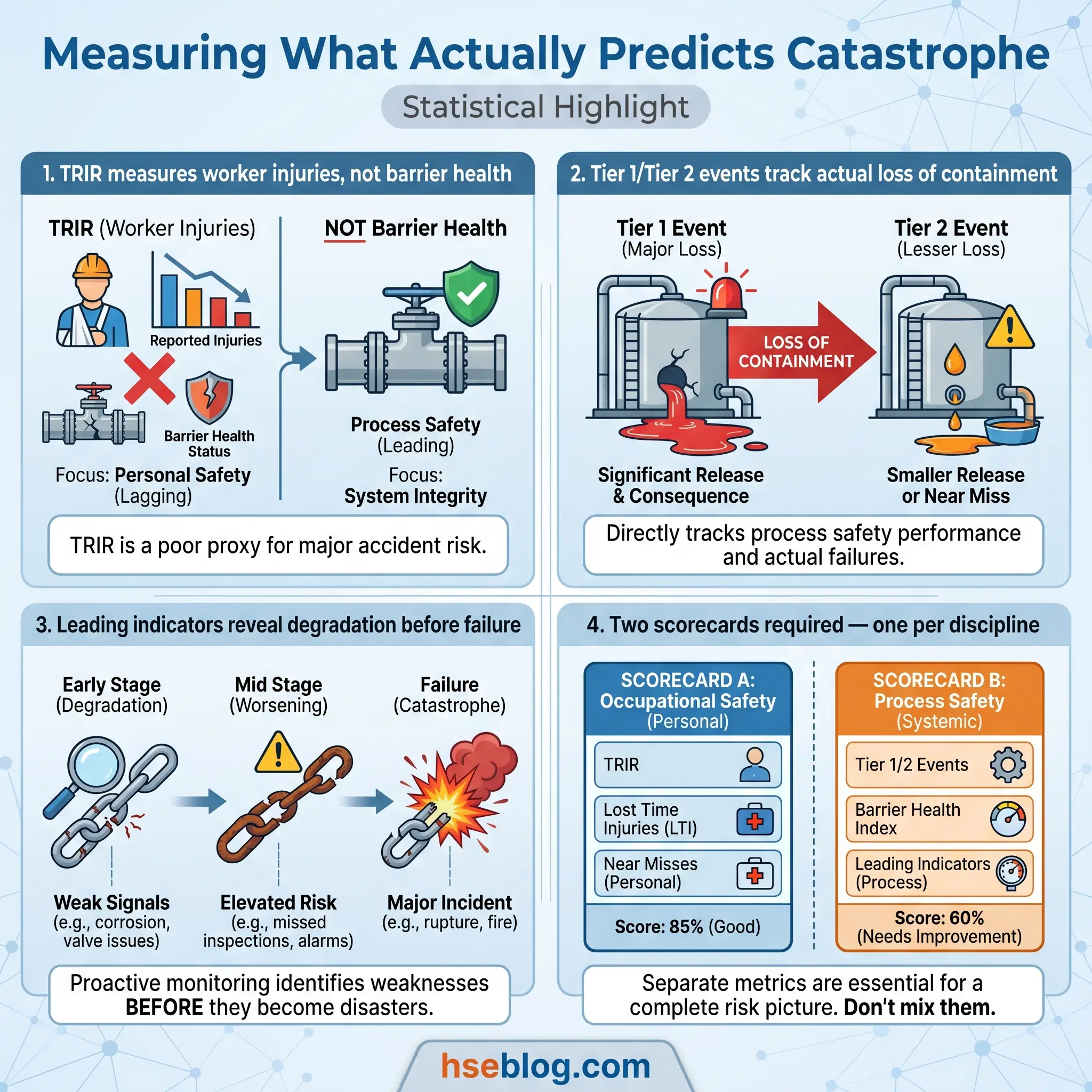 Injury metrics are lagging indicators for worker-level harm. They count events that have already happened — recordable injuries, lost-time cases, first-aid treatments. They are useful for what they measure. The problem is what they do not measure. A corroded pressure vessel that has not yet ruptured does not appear in the TRIR. An overdue proof test on a high-integrity pressure protection system generates no recordable incident. A management of change request that was approved without adequate technical review creates no lost-time injury — until the day the modified process exceeds its design envelope and a catastrophic release occurs.