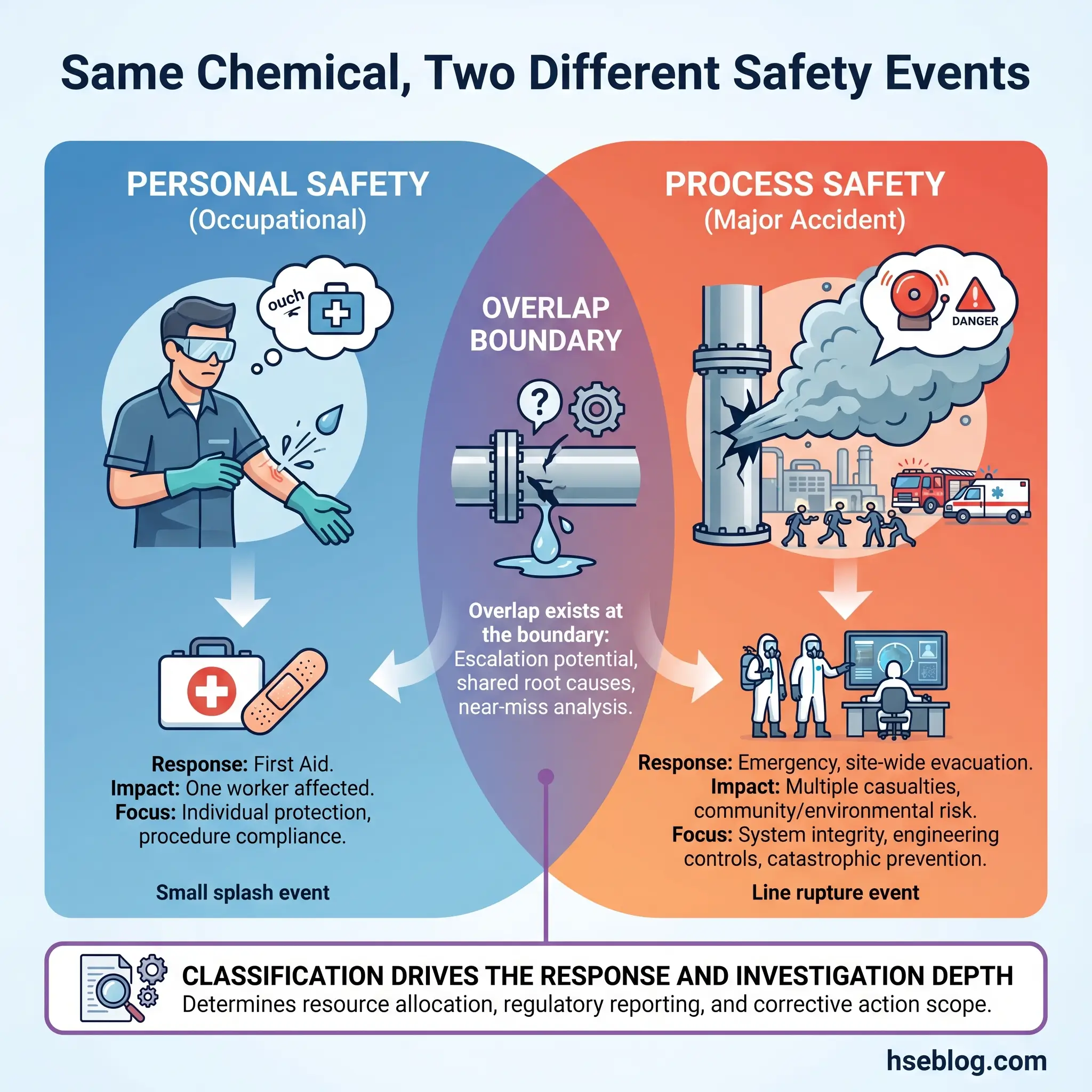 Where they overlap: A small chemical splash during a sample draw is a personal safety incident — one worker, one injury, resolved with first aid and a procedure review. But if that same chemical line develops a full-bore rupture during maintenance because the energy isolation was inadequate and the line contained residual hydrogen sulfide, the event crosses into process safety territory: multiple potential fatalities, emergency response activation, regulatory notification.