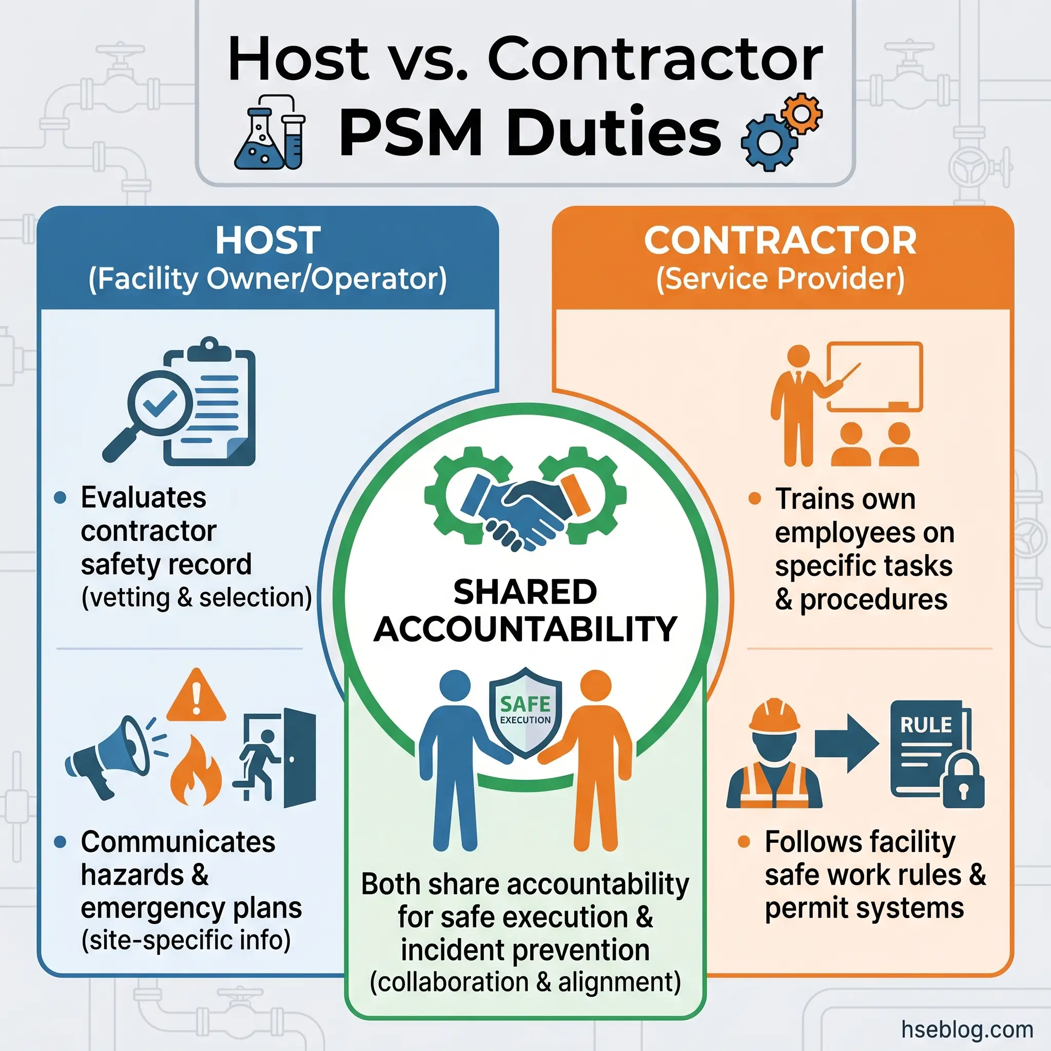 During turnarounds, I’ve seen contractor crews arrive with their own safety cultures, procedures, and assumptions — some excellent, some dangerously incompetent. The host facility cannot outsource its PSM obligations along with the work scope. If a contractor’s cutting torch ignites a vapor cloud in your process area, your PSM program failed — regardless of whose employee held the torch.