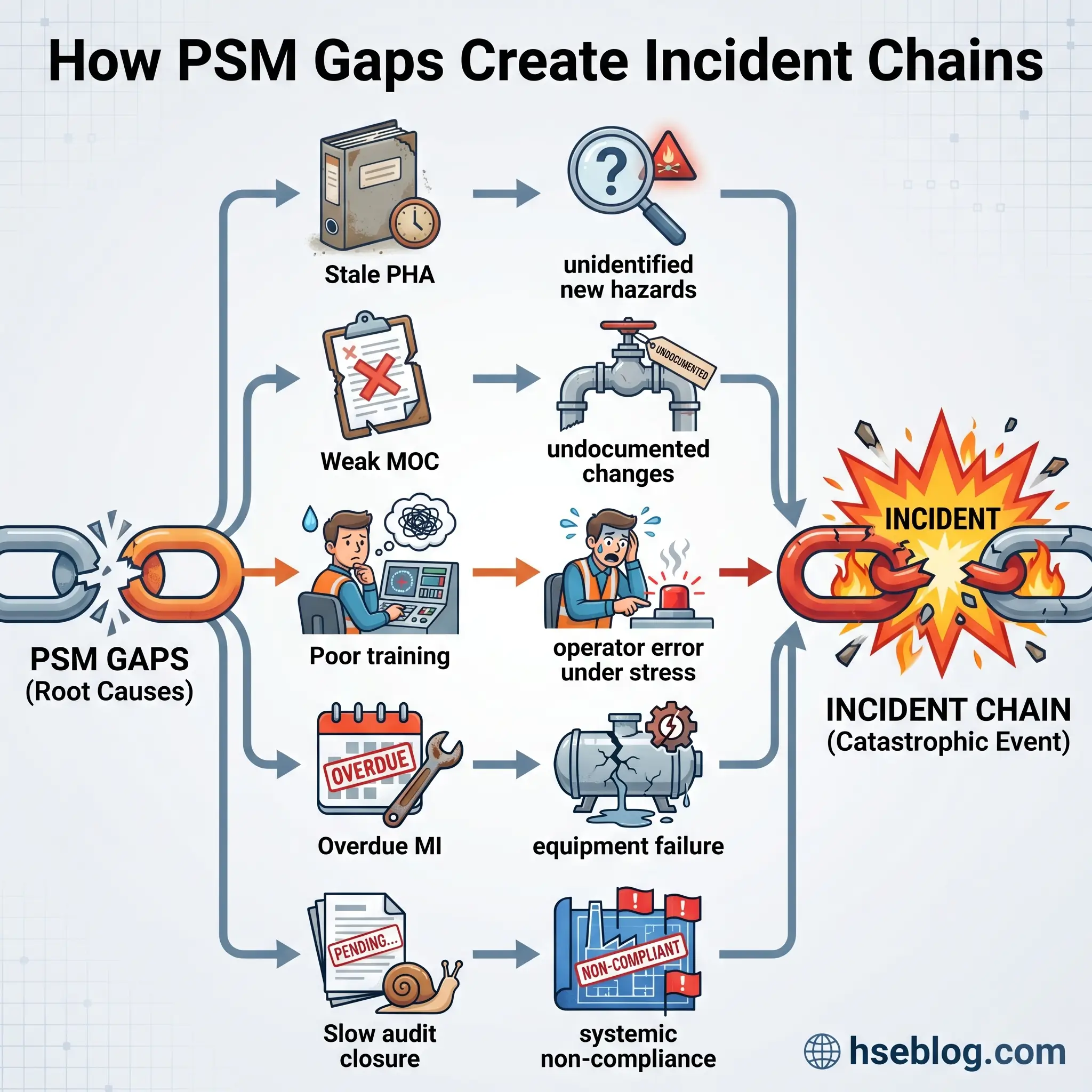 A weak mechanical integrity program, for example, doesn’t just create equipment failure risk. It undermines the PHA (which assumed equipment would perform to specification), invalidates operating procedures (which assumed instrumentation would function), and creates training gaps (because operators weren’t informed about degraded equipment conditions). One broken link cascades.
