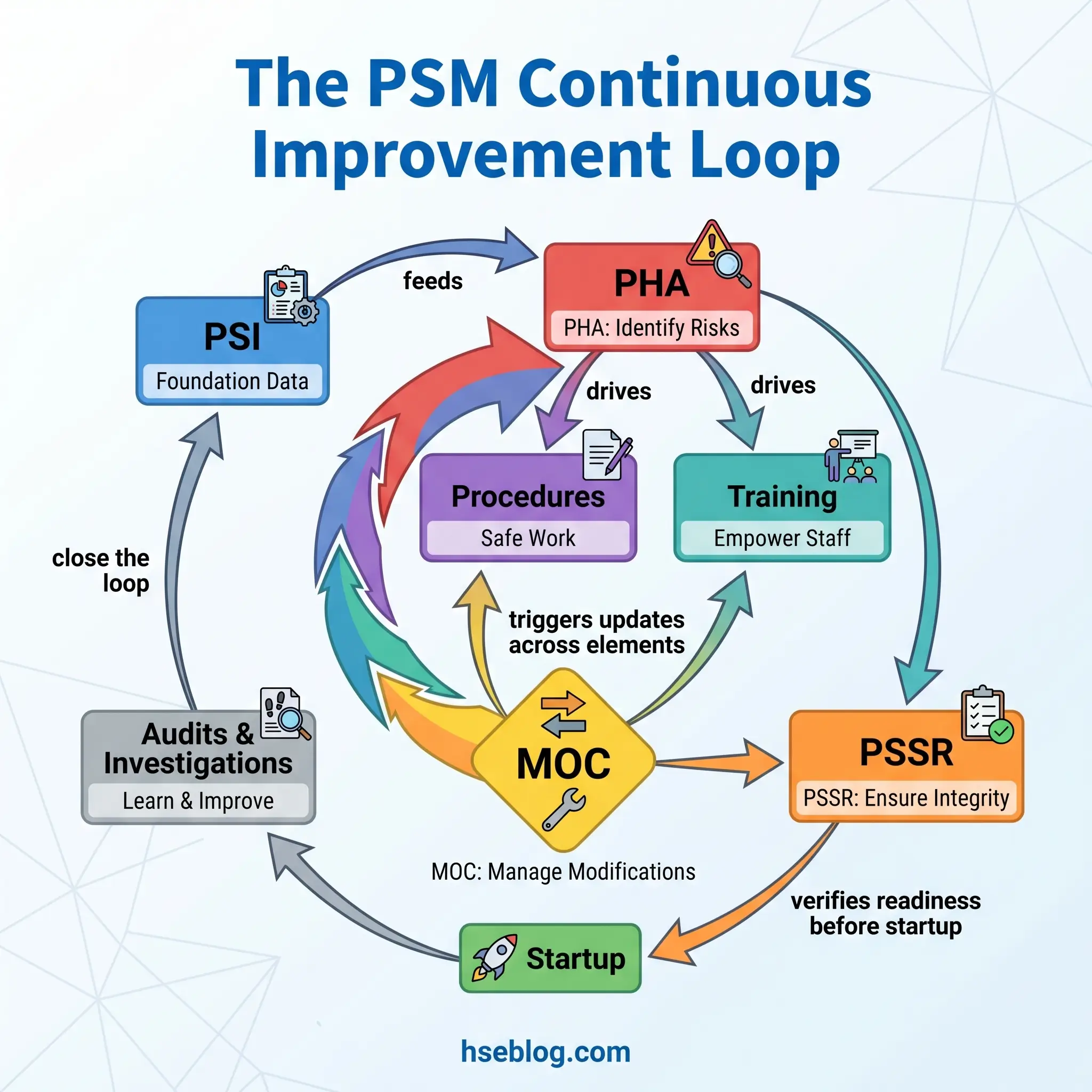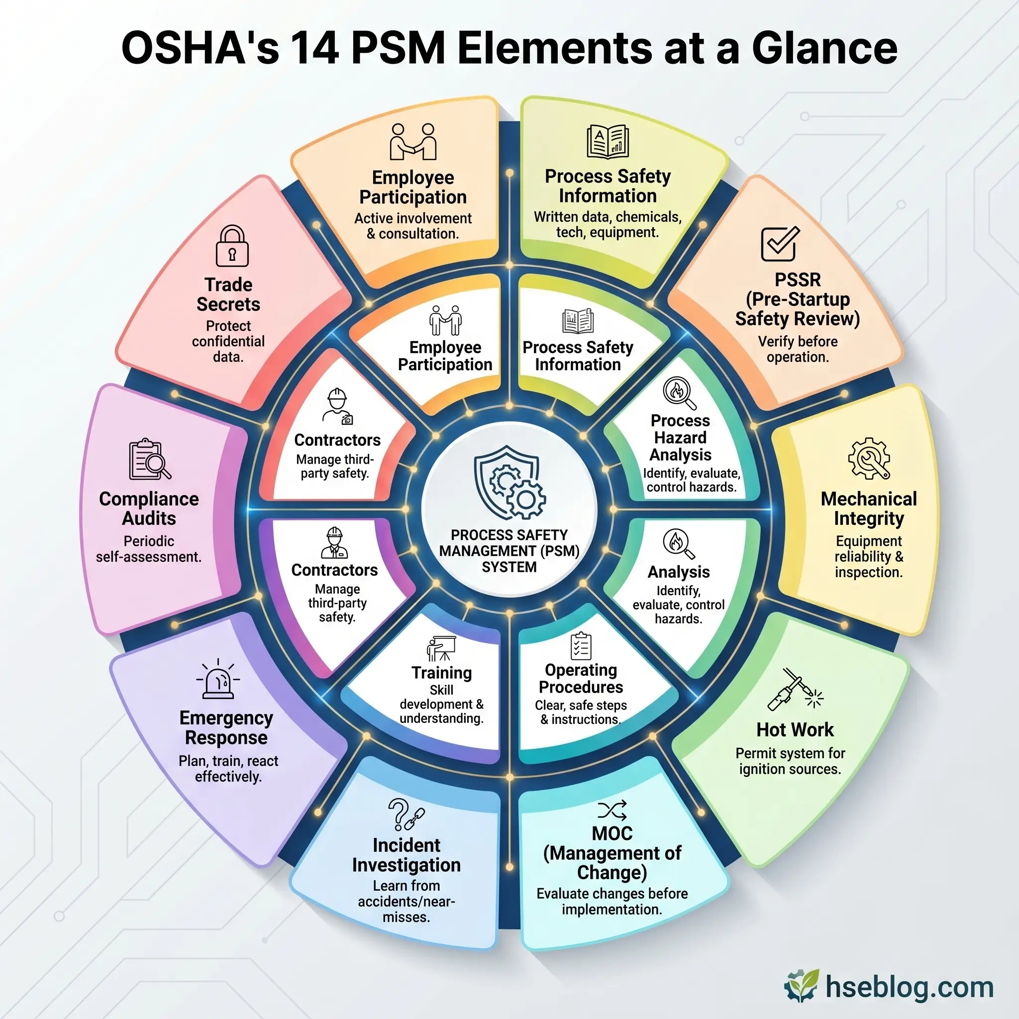 Fourteen elements. One system. Process safety management works when every element feeds information to the elements that depend on it — and when management treats the system as an active operational control rather than a compliance archive. The single highest-impact change most facilities can make is shifting from element-by-element compliance to systems-level thinking: asking not just “is each element complete?” but “are the connections between elements functioning?”