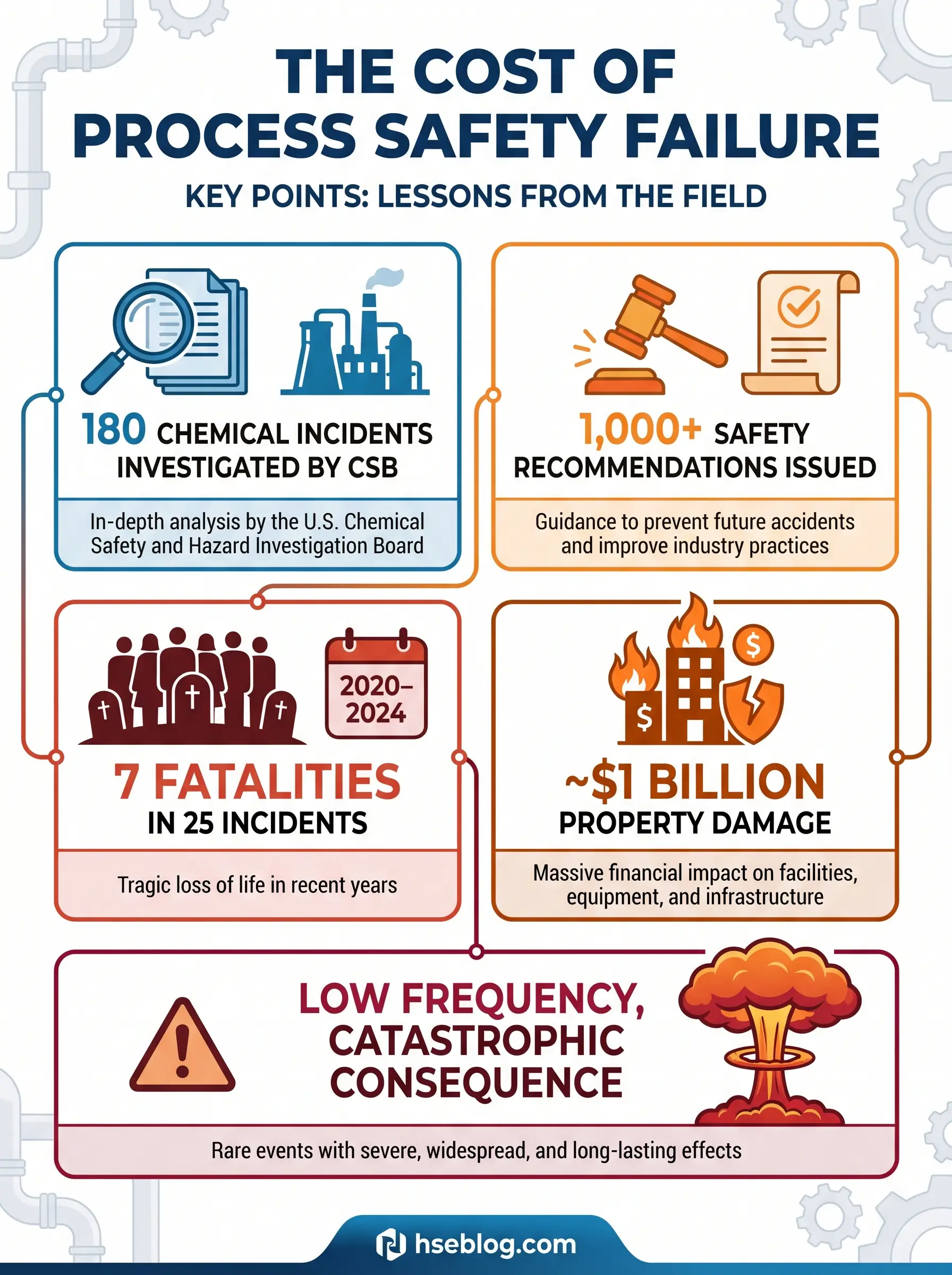 That distinction — between everyday workplace hazards and low-frequency, catastrophic process events — is exactly what this article covers. The U.S. Chemical Safety Board (CSB) has deployed to nearly 180 chemical incidents over its 25-year history and issued more than 1,000 safety recommendations. Its Volume 2 incident reports alone documented 25 serious chemical incidents between May 2020 and August 2024, producing 7 fatalities, 23 serious injuries, and roughly $1 billion in property damage. These numbers belong to facilities that had safety programs on paper. What separates a facility that prevents a catastrophic release from one that generates a CSB investigation is whether its process safety management system actually functions as a system — not as fourteen binders on a shelf.