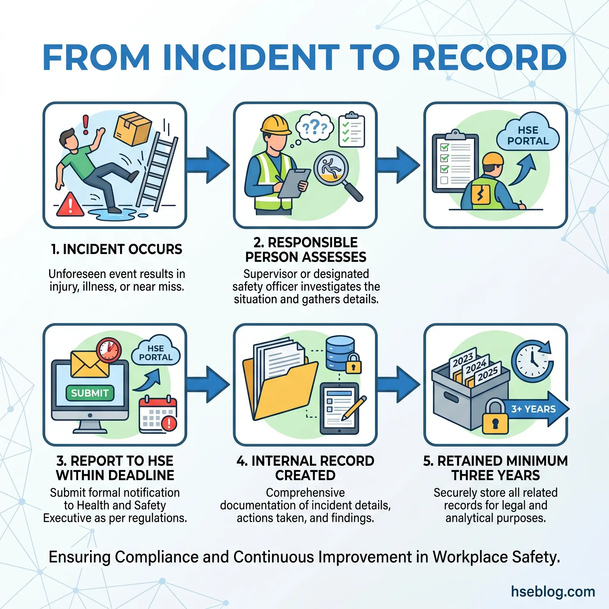 RIDDOR compliance reduces to four practical decisions, repeated every time an incident reaches the safety desk. First, identify the responsible person — and make sure they know it is them, not the injured party, not the witness, not the subcontractor. Second, test the event against the seven reporting categories and the explicit exemptions; if it fails both, record it in the accident book and move on. Third, diary the correct deadline — 10 days for most categories, 15 days for over-seven-day injuries, “without delay” by phone for fatalities — and file the submission through the HSE’s online portal or Incident Contact Centre. Fourth, close the loop with an internal record that meets the Regulation 12 content requirements and survives at least three years.