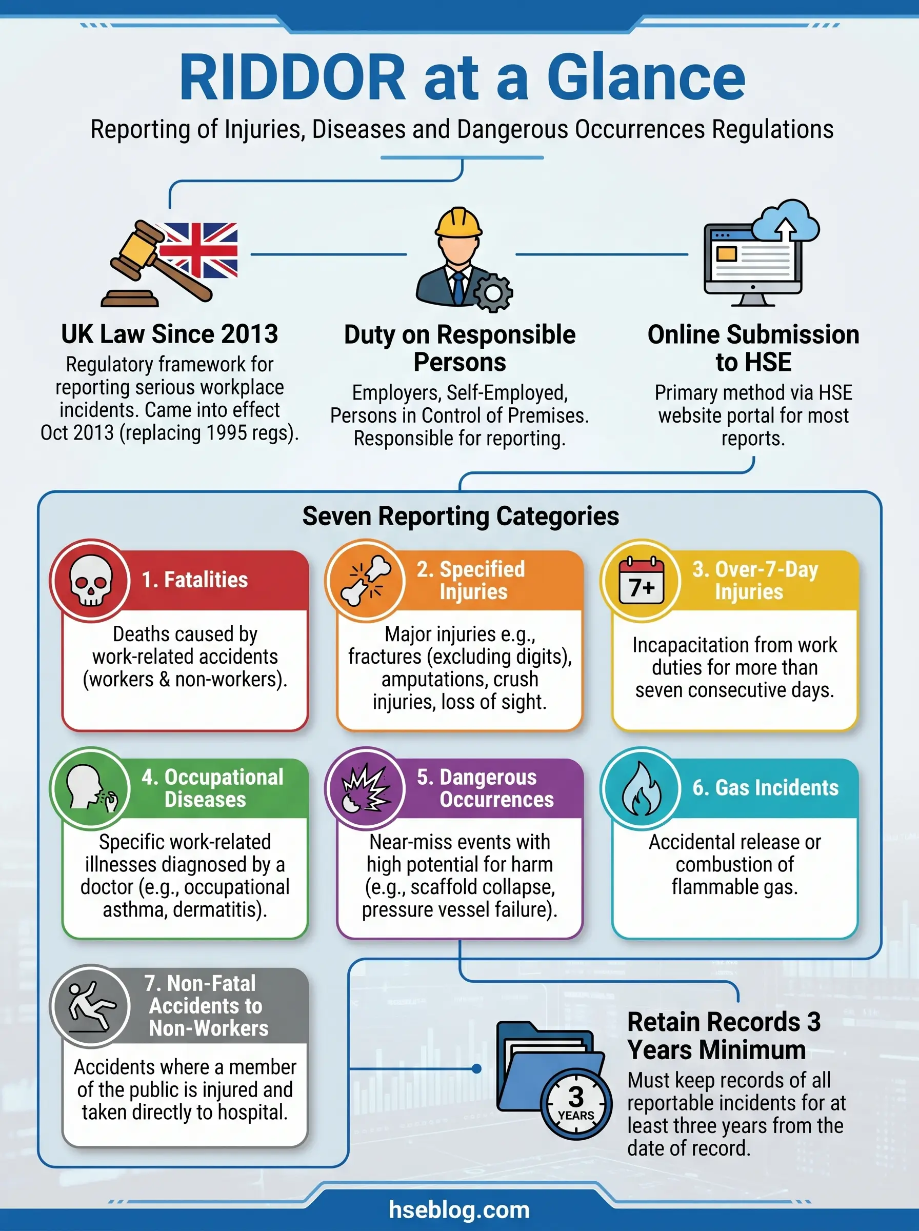 The full text of the regulations is available on legislation.gov.uk, and the HSE’s landing page at hse.gov.uk/riddor is the authoritative reference point for duty holders.