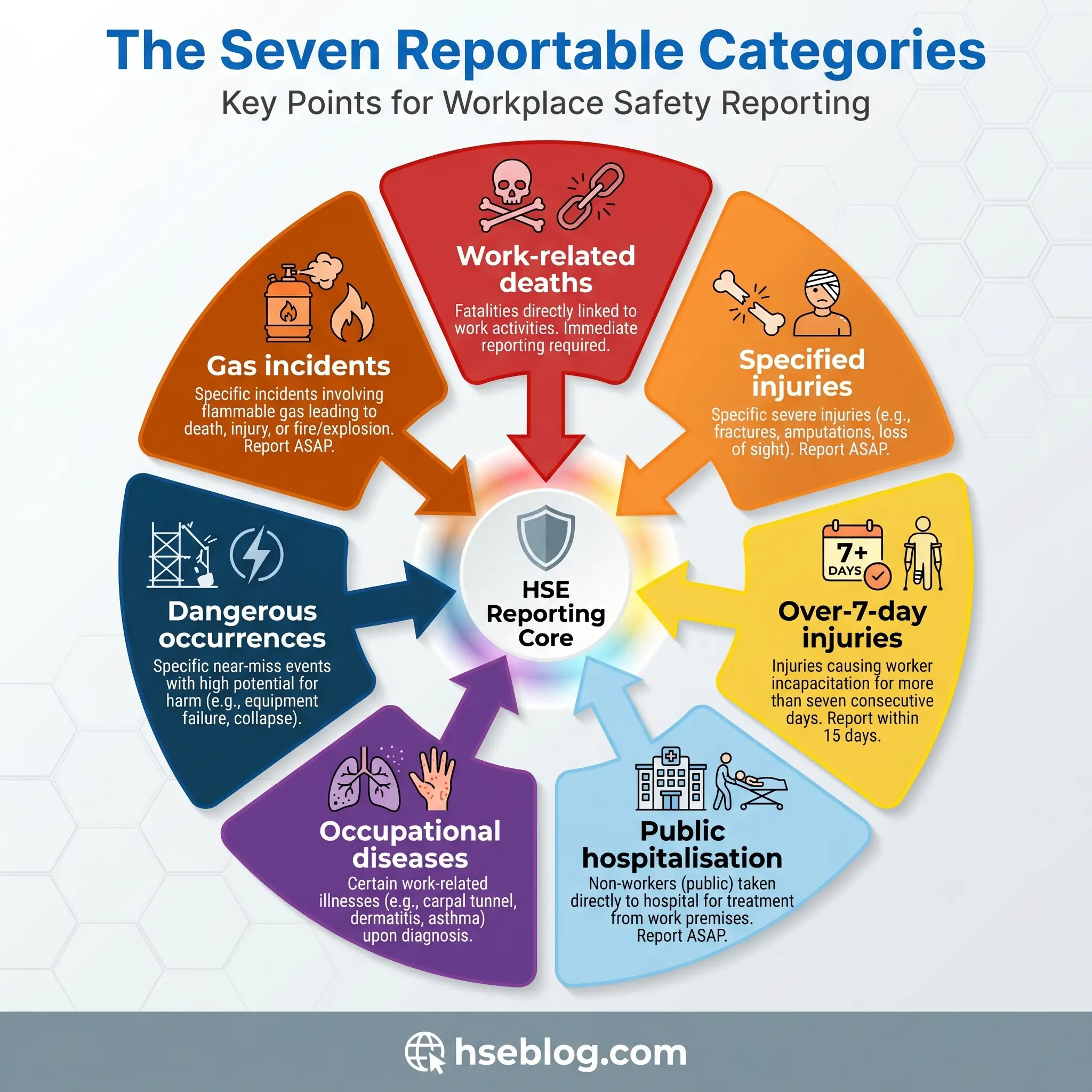 Each category has its own triggers, thresholds, and exclusions. The HSE’s definitive list of reportable incidents should sit in every safety team’s reference folder, but here is how each category breaks down in practice.