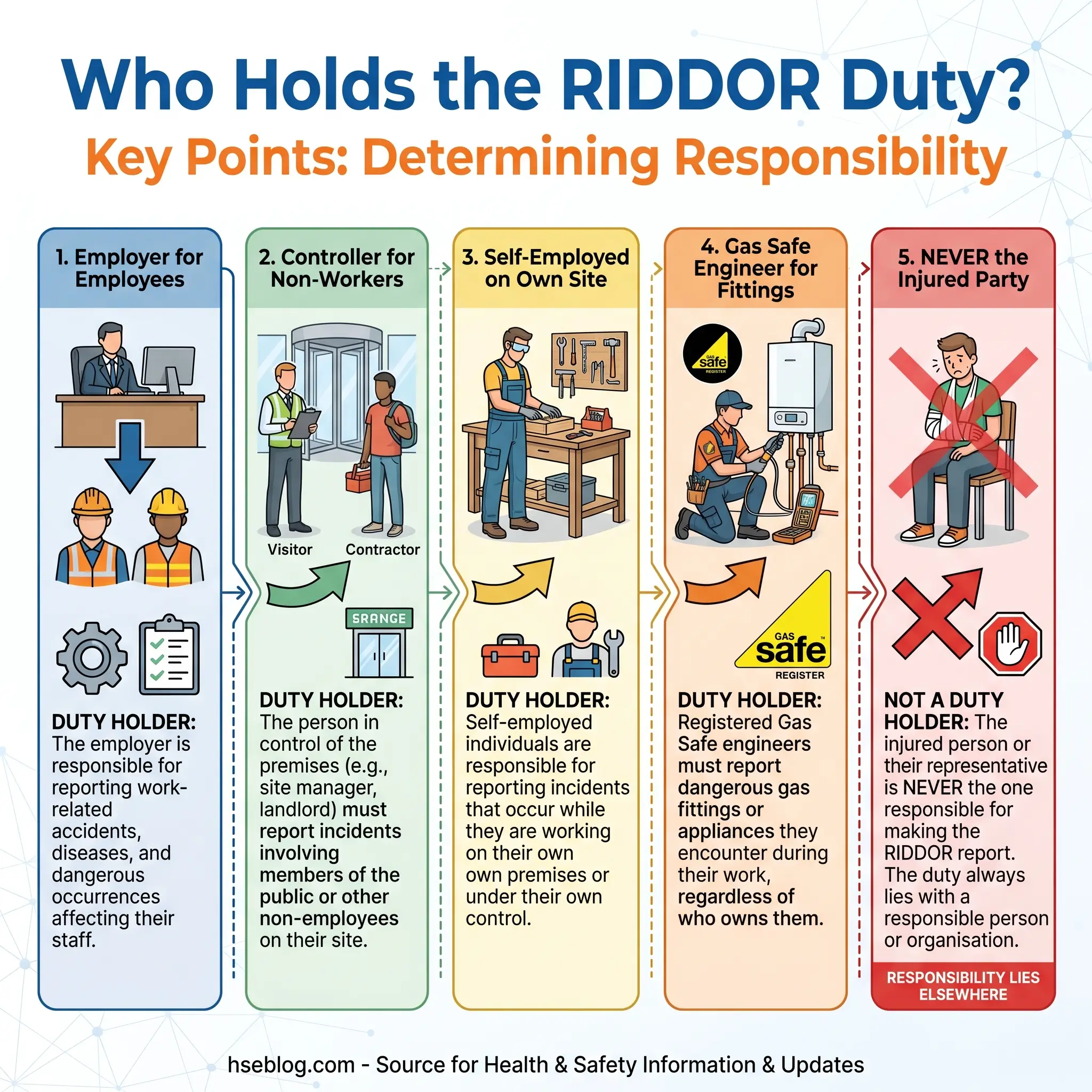 Regulation 2 of RIDDOR 2013 defines the “responsible person” — and this is the element that causes the most confusion on mixed sites. The injured party does not report. The witness does not report. Only the responsible person has the legal duty, and identifying them depends on the scenario.