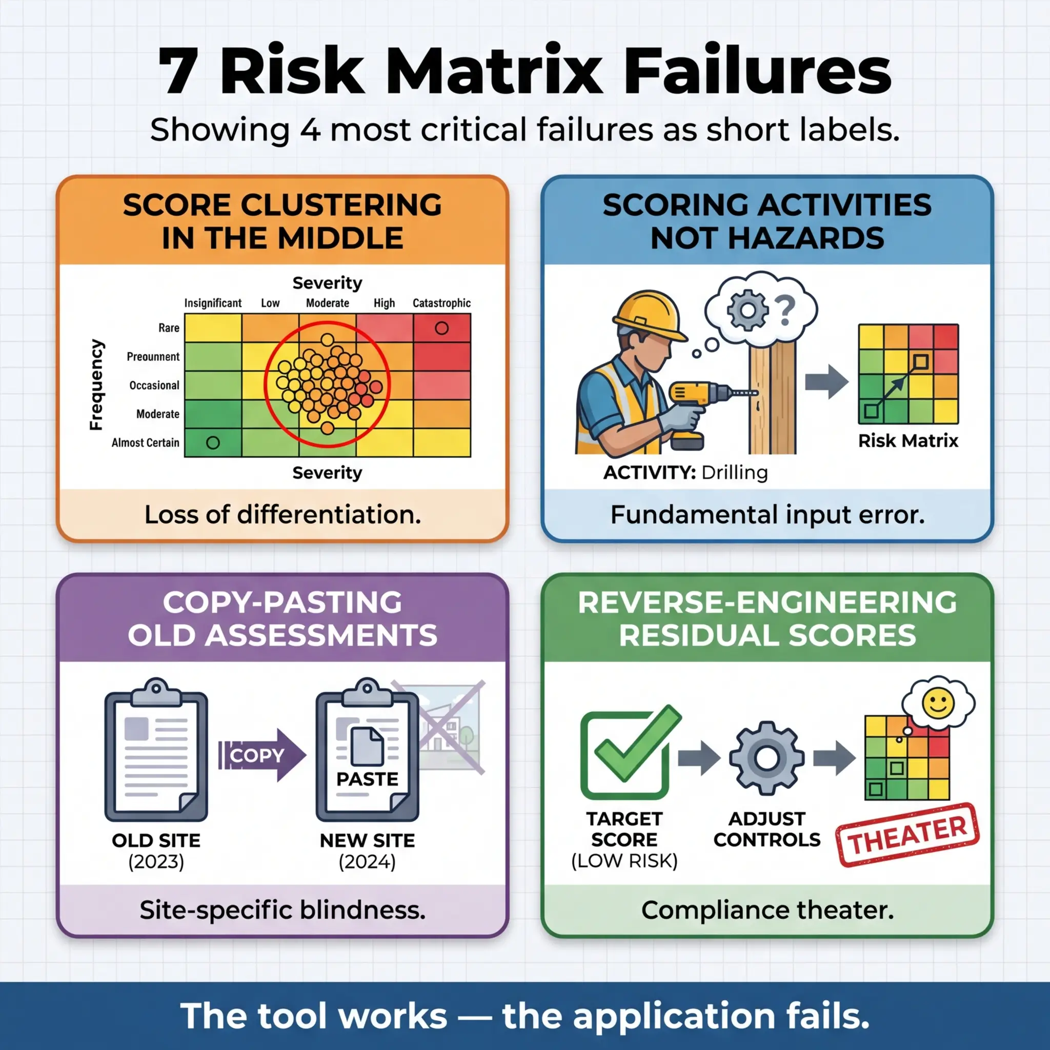 Over a decade of auditing risk assessments across construction, oil and gas, mining, and manufacturing, I’ve catalogued the same failure patterns appearing with striking consistency. The risk matrix as a tool isn’t the problem — it’s a simple, effective framework. The failures are human, organizational, and systemic. Recognizing these patterns is the first step toward fixing them.