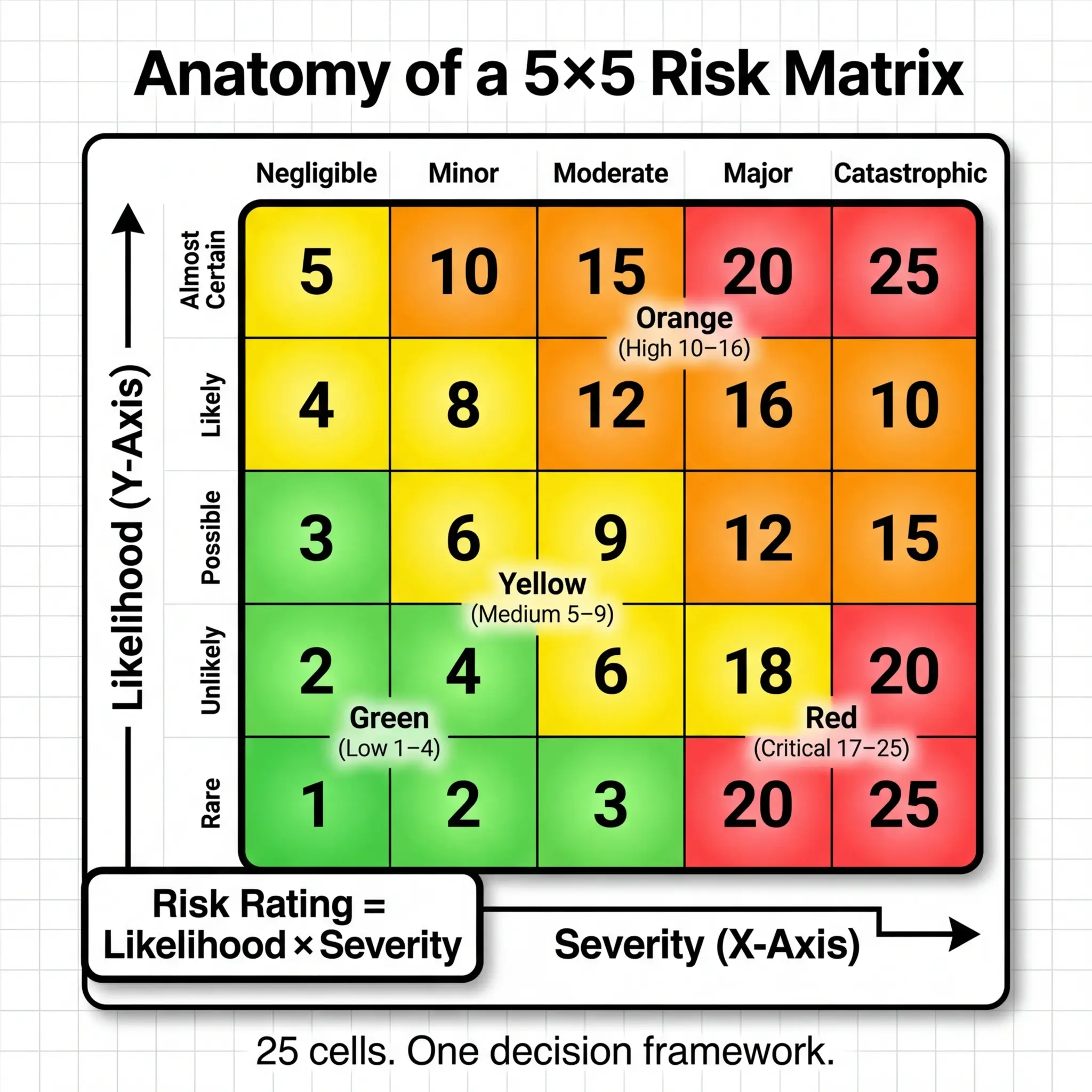 - Coarse resolution. A 5×5 matrix has only 25 possible scores. Complex, multi-variable risks are compressed into a single number. A hazard scored 12 and another scored 12 may have fundamentally different risk profiles that the matrix cannot distinguish.
