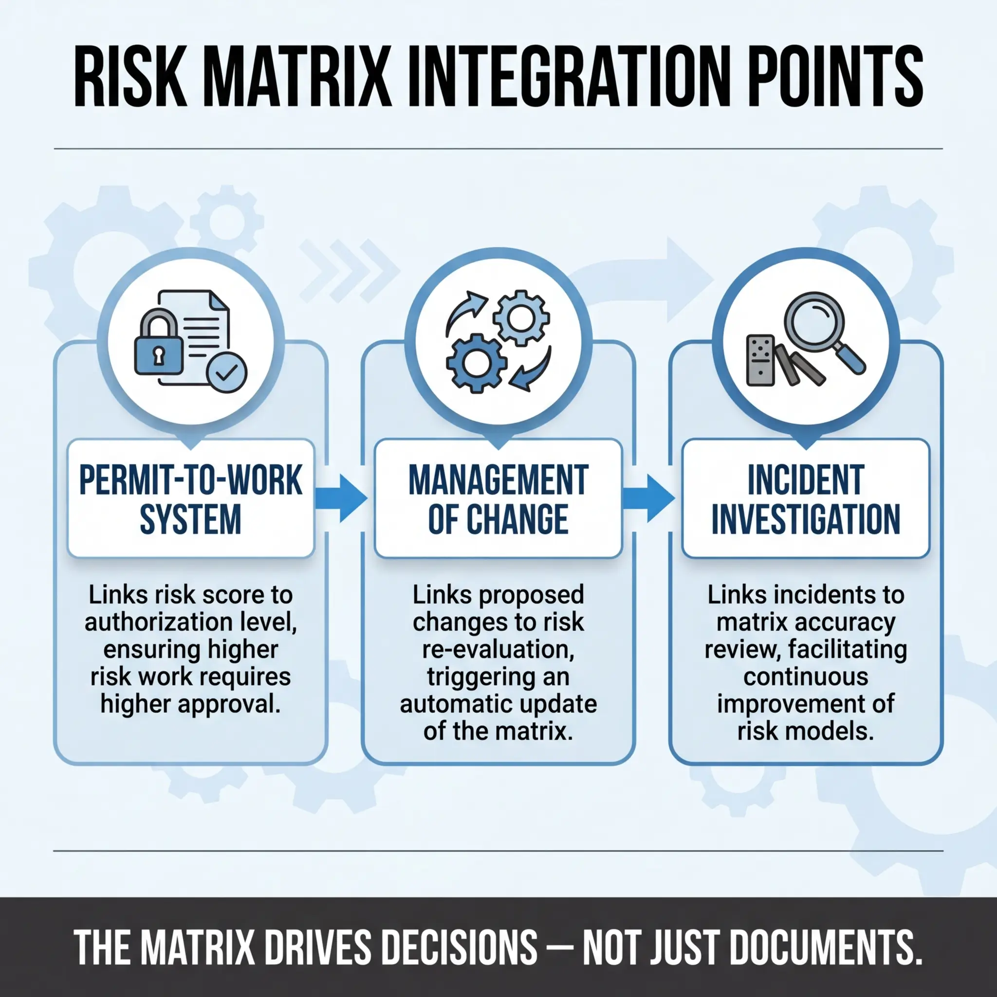 A risk matrix that lives only inside a standalone risk assessment document has limited operational impact. The real power emerges when it integrates into the daily decision-making systems that control work on site — permits to work, management of change processes, and incident investigation frameworks.