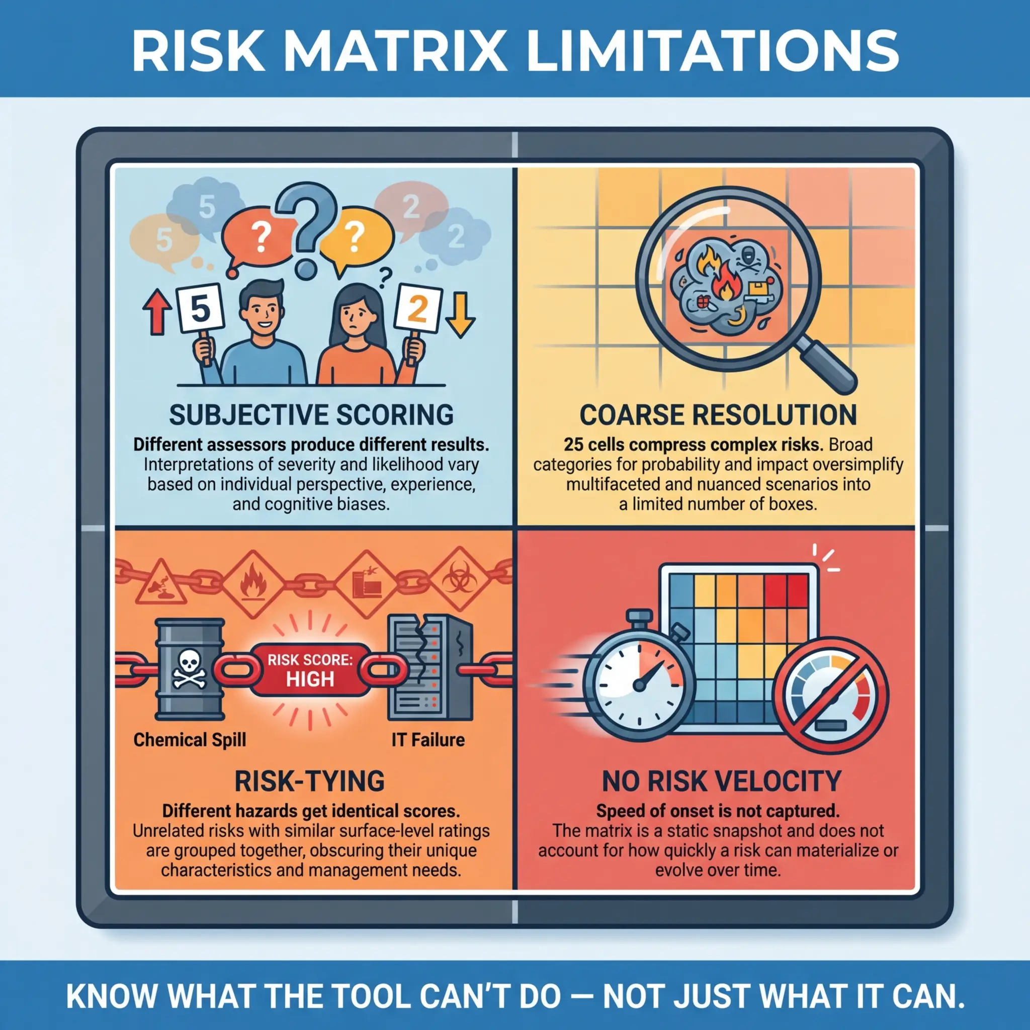 No experienced safety professional should treat a risk matrix as infallible. It is a semi-quantitative tool built on subjective judgment, and its limitations are well-documented in risk management literature. Acknowledging these limitations doesn’t weaken the tool — it strengthens how you use it by setting appropriate expectations.