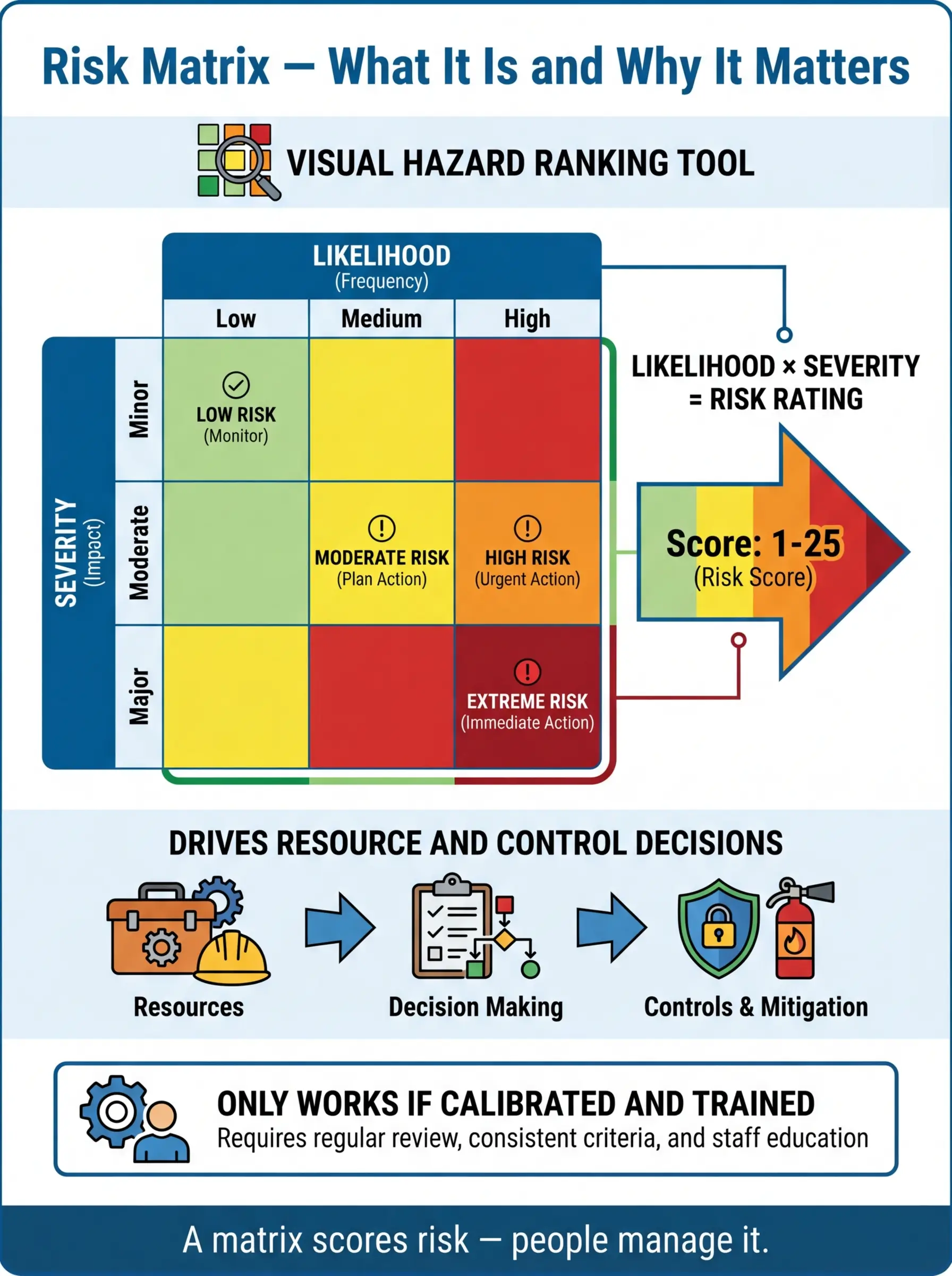 - A risk matrix is a visual grid that ranks hazards by likelihood and severity, giving safety teams a consistent, defensible method to prioritize which risks demand immediate action and which can be managed through routine controls.