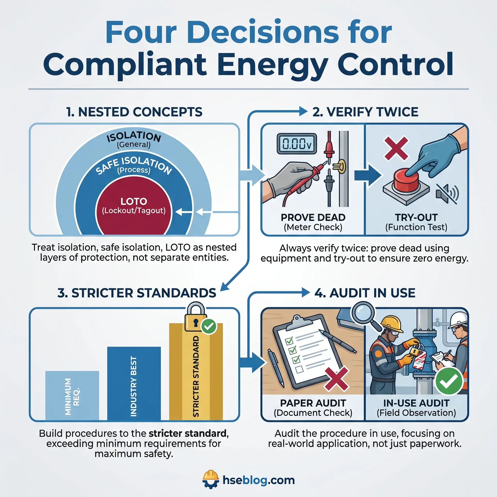 Four decisions drive safe energy control regardless of which flag flies over the site. Treat isolation as the physical act, safe isolation as the UK electrical procedure wrapped around that act, and LOTO as the full program that makes isolation reliable at scale across all energy types. Verify twice — prove dead for electrical work, try-out for control circuits — because each test answers a different question and neither is a full substitute. Build your procedure to the stricter of the two standards on every element: GS38 hardware for verification, 1910.147 program structure for documentation and training, ISO 14118 principles for stored energy. Audit against the procedure in use, not the procedure on paper — the annual inspection requirement in 1910.147(c)(6) exists precisely because drift is inevitable.