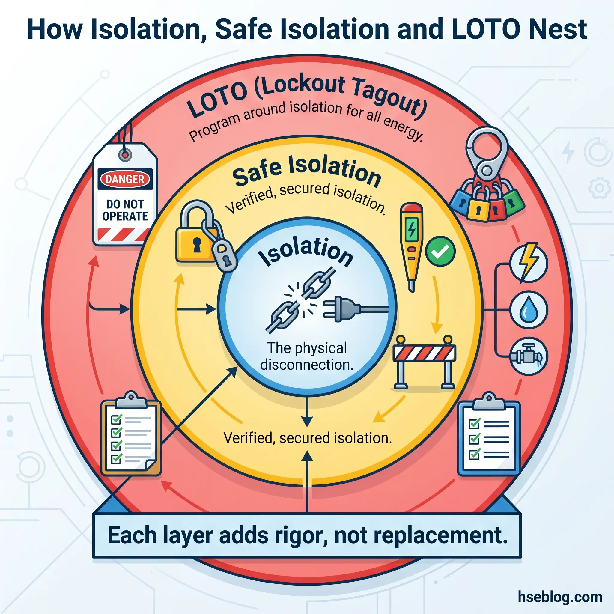 This is where most explanations fall apart. Isolation, safe isolation, and LOTO are three nested concepts, not three synonyms.