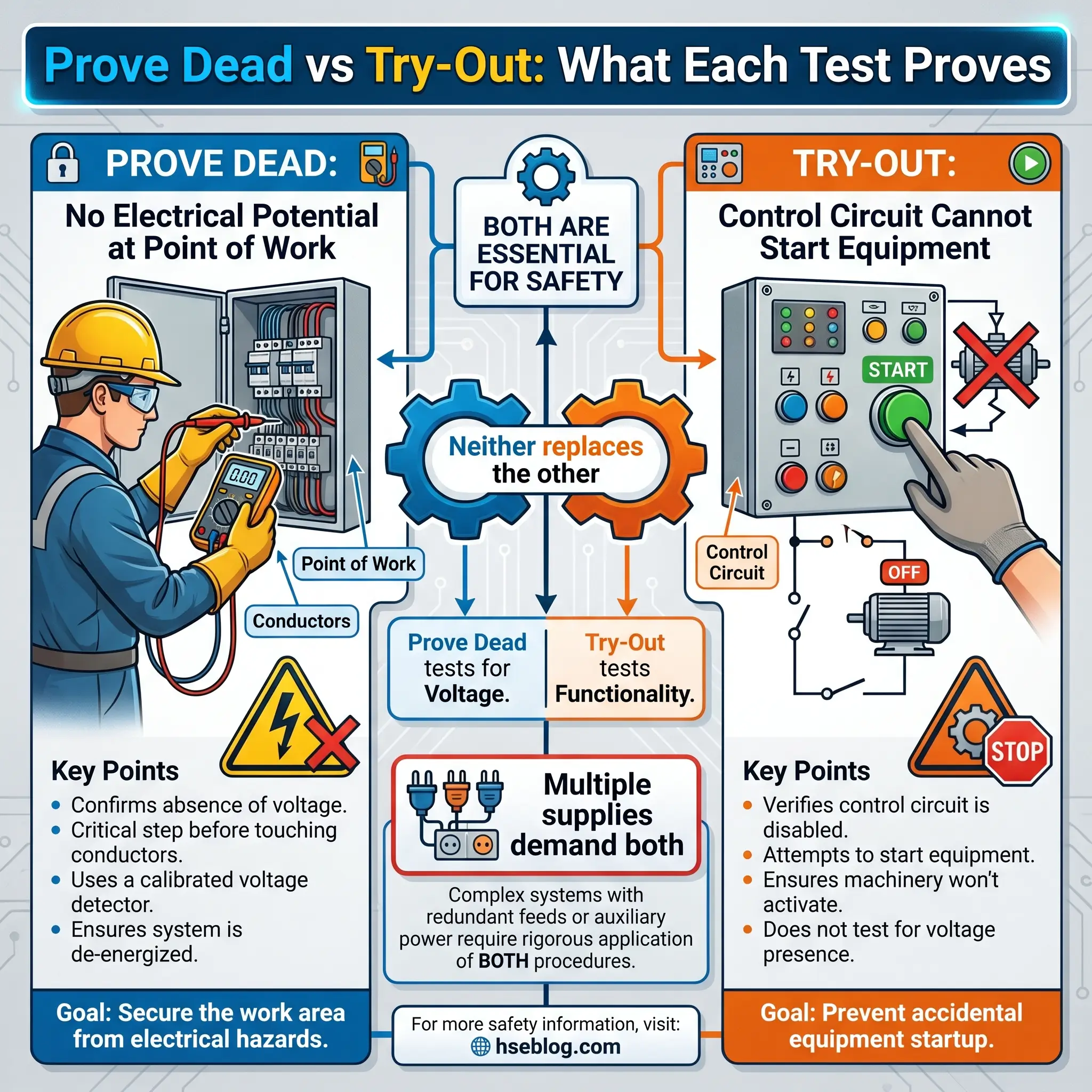 These two verifications answer different questions. Prove dead confirms the absence of electrical potential at a specific point. Try-out confirms the control circuit cannot energize the power circuit through its normal path. Neither is a complete substitute for the other.