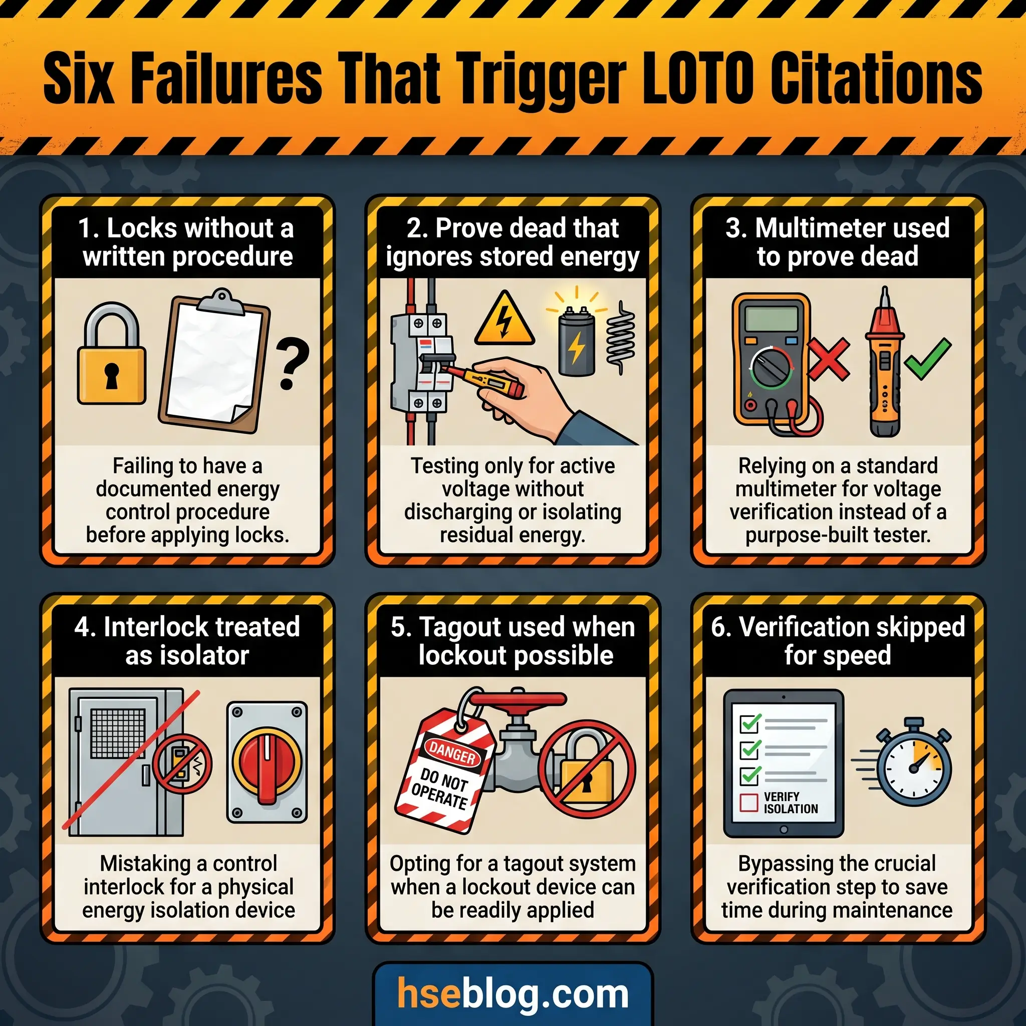 - “We have locks, so we have LOTO.” Locks are necessary but not sufficient. A compliant program requires written machine-specific procedures, authorized-employee training, and annual periodic inspection. A wall of padlocks with no procedure is a citation waiting to happen.