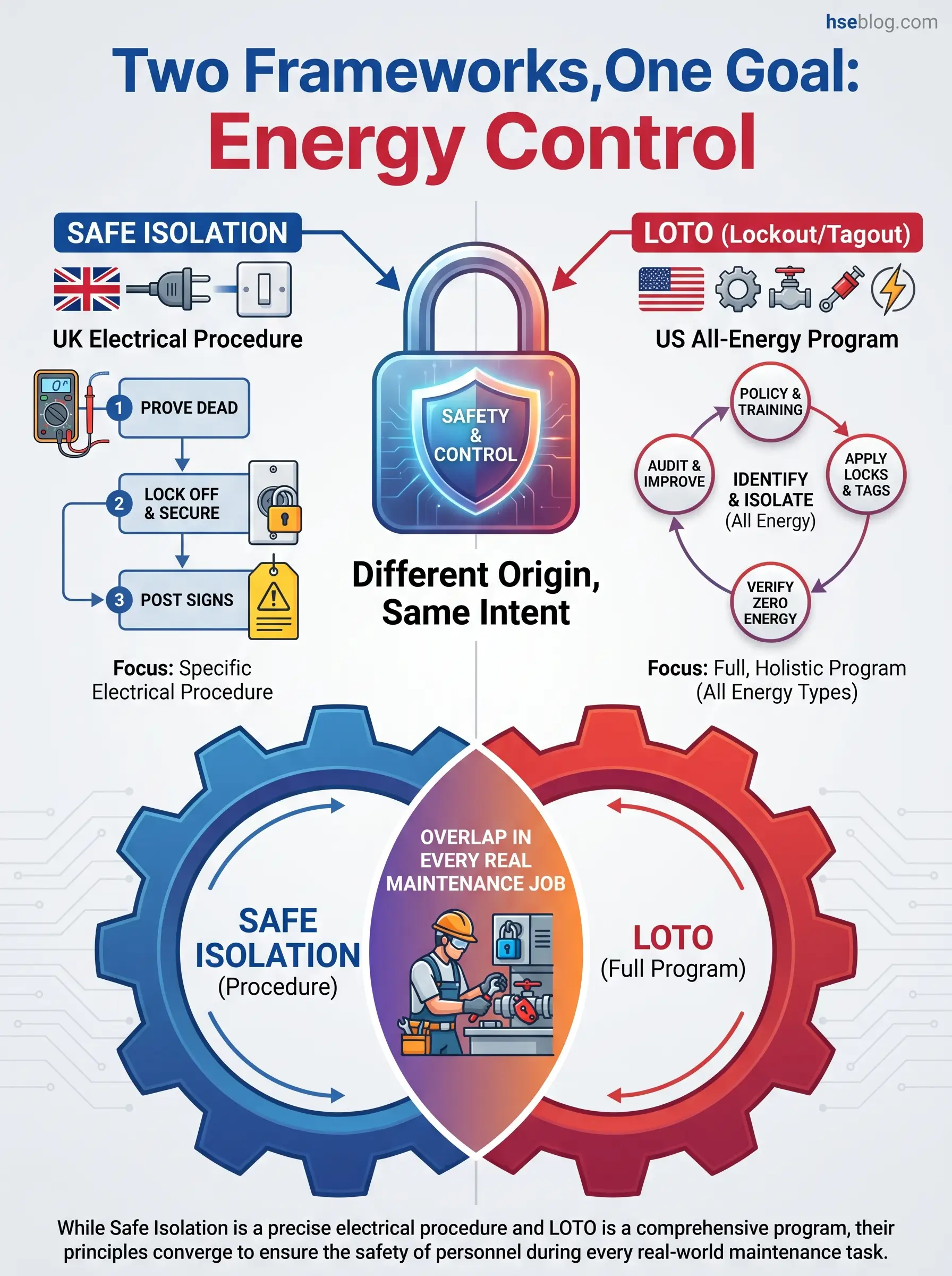 | Dimension | Safe Isolation (UK/EU) | Lockout/Tagout (US/OSHA) |