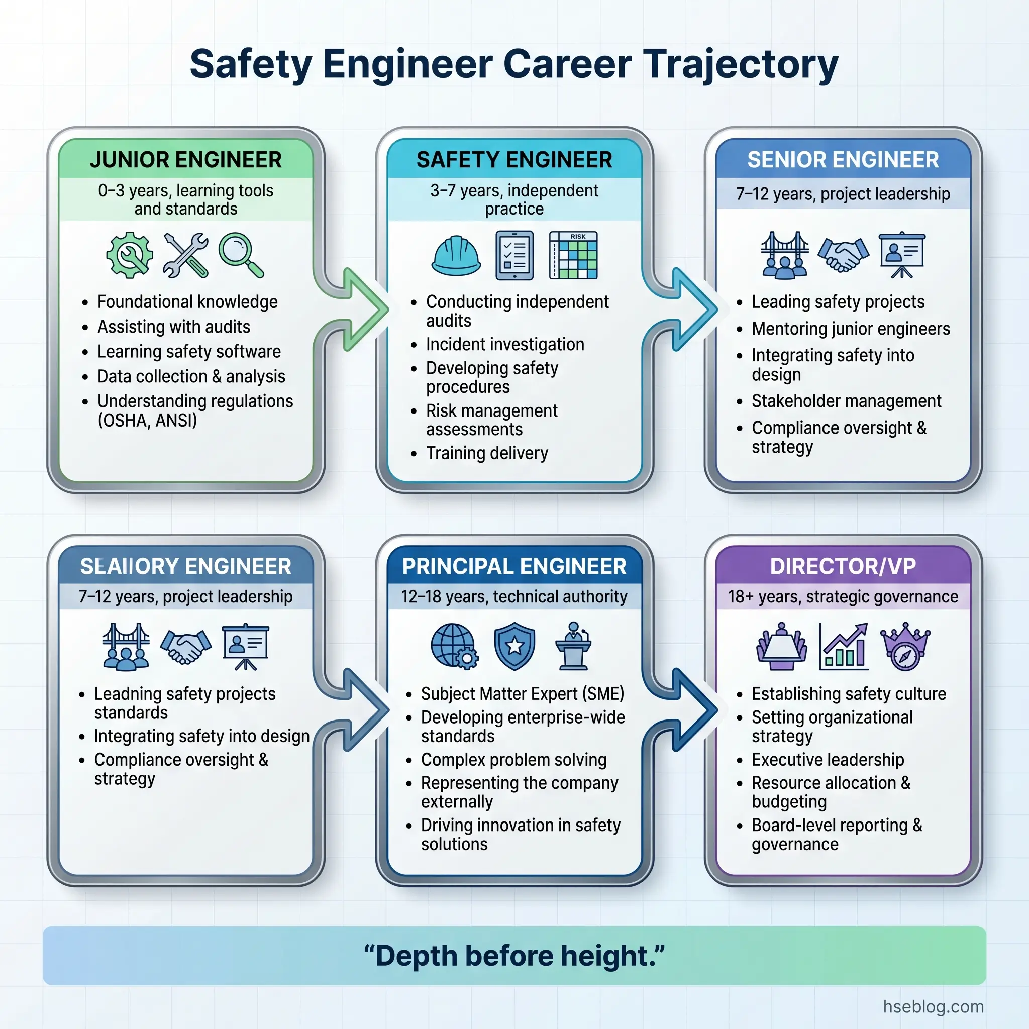 - Principal/Lead Safety Engineer (12–18 years): Setting technical direction for safety engineering teams, establishing company standards and methodologies, providing expert witness testimony, leading accident investigations of national significance