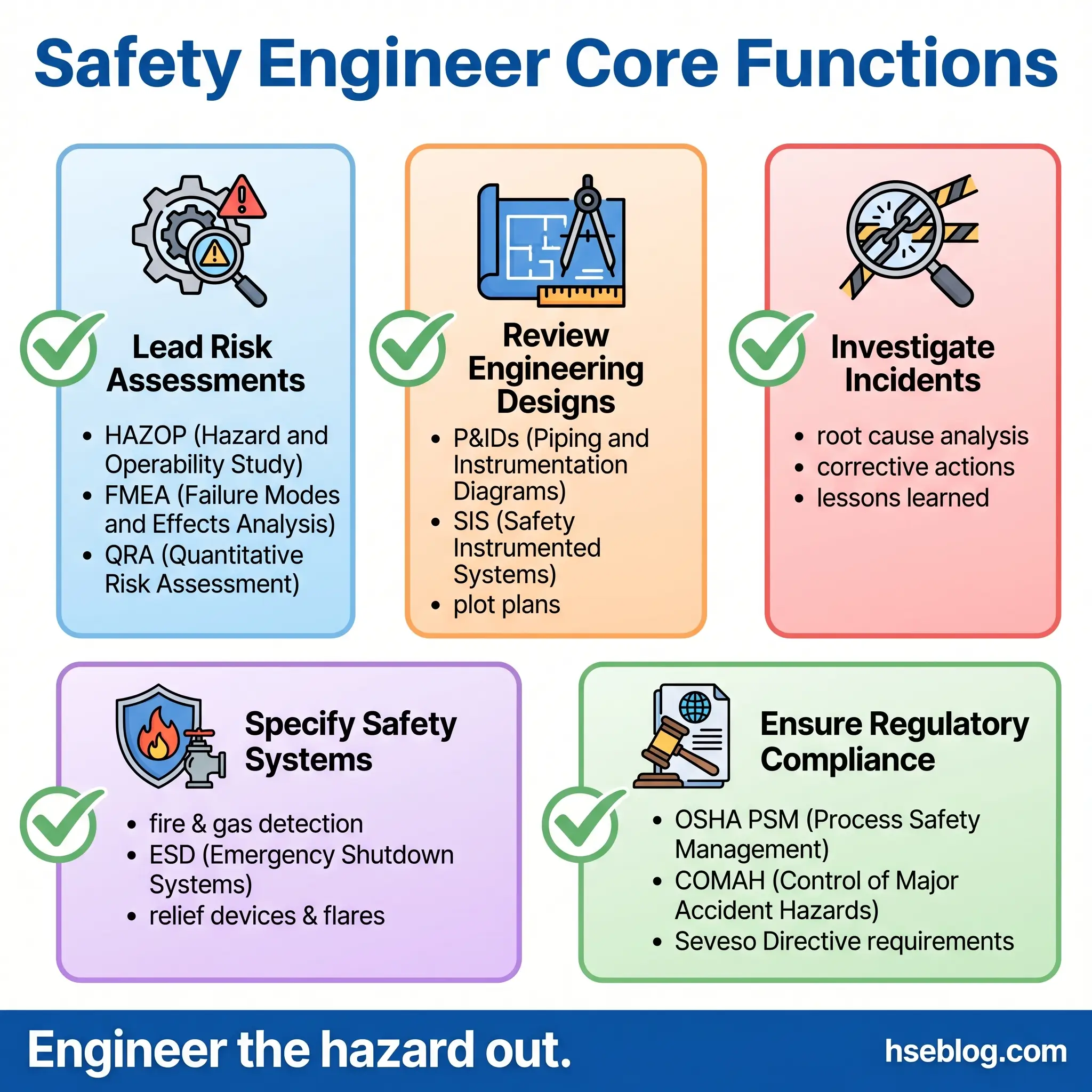 | Safety Engineer | Hazard elimination through design and engineering controls | HAZOP, FMEA, QRA, fault tree analysis | Design offices, project engineering, process facilities |