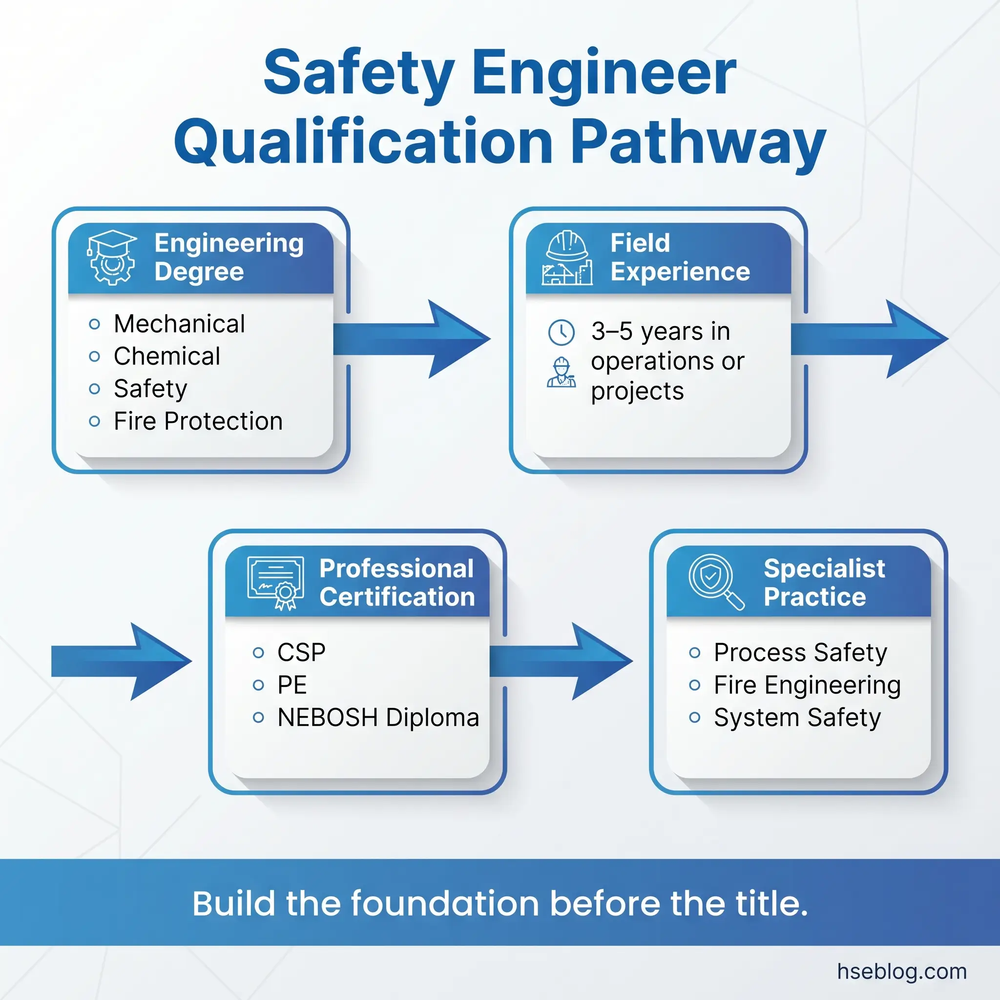 The qualification pathway for a safety engineer is distinctly more technical than for most HSE roles. This is not a career path where a two-week diploma substitutes for a degree. The engineering component is non-negotiable — and I’ve seen hiring panels reject candidates with decades of safety experience because they lacked the engineering foundation to perform technical analysis.