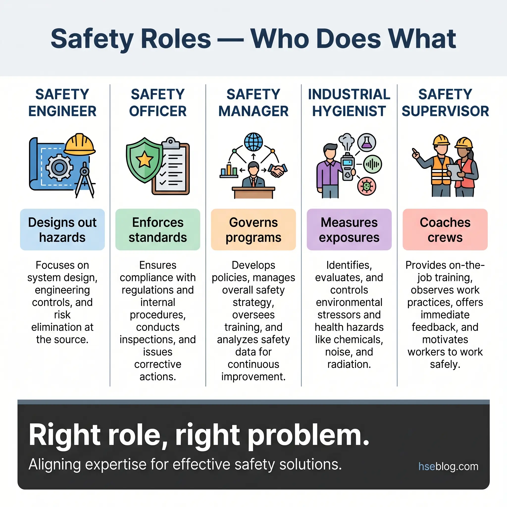 One of the most common points of confusion in the HSE field — and I’ve seen it cause real organizational dysfunction — is treating safety engineers, safety officers, safety managers, and industrial hygienists as interchangeable roles. They are not. Each has a distinct function, and misaligning them creates blind spots.