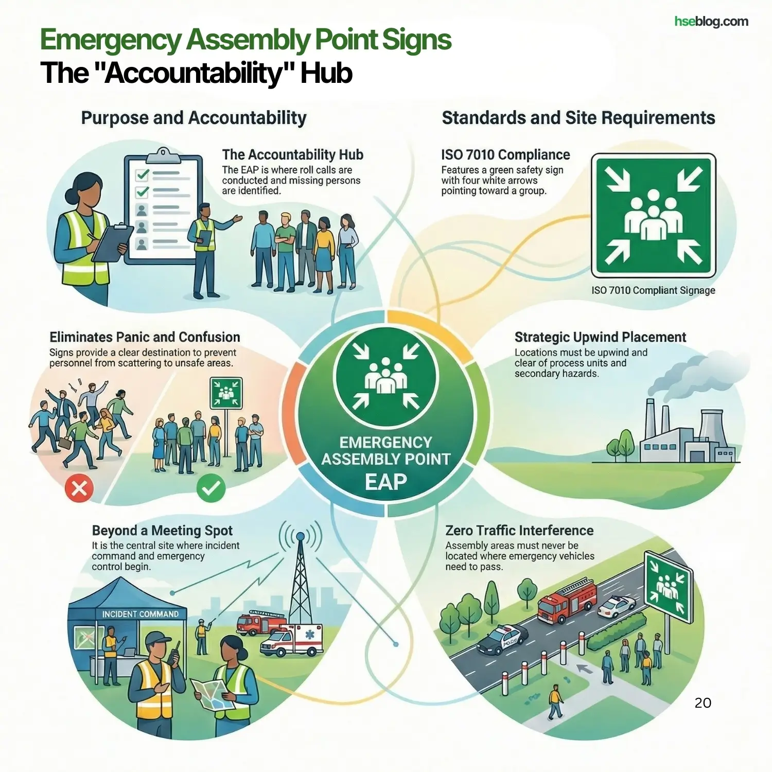 - Audit Check: Are these signs visible along evacuation routes and at final exits? Is the assembly point located upwind, away from process units, traffic routes, and secondary hazards? If emergency vehicles pass through the assembly area, the location is wrong.