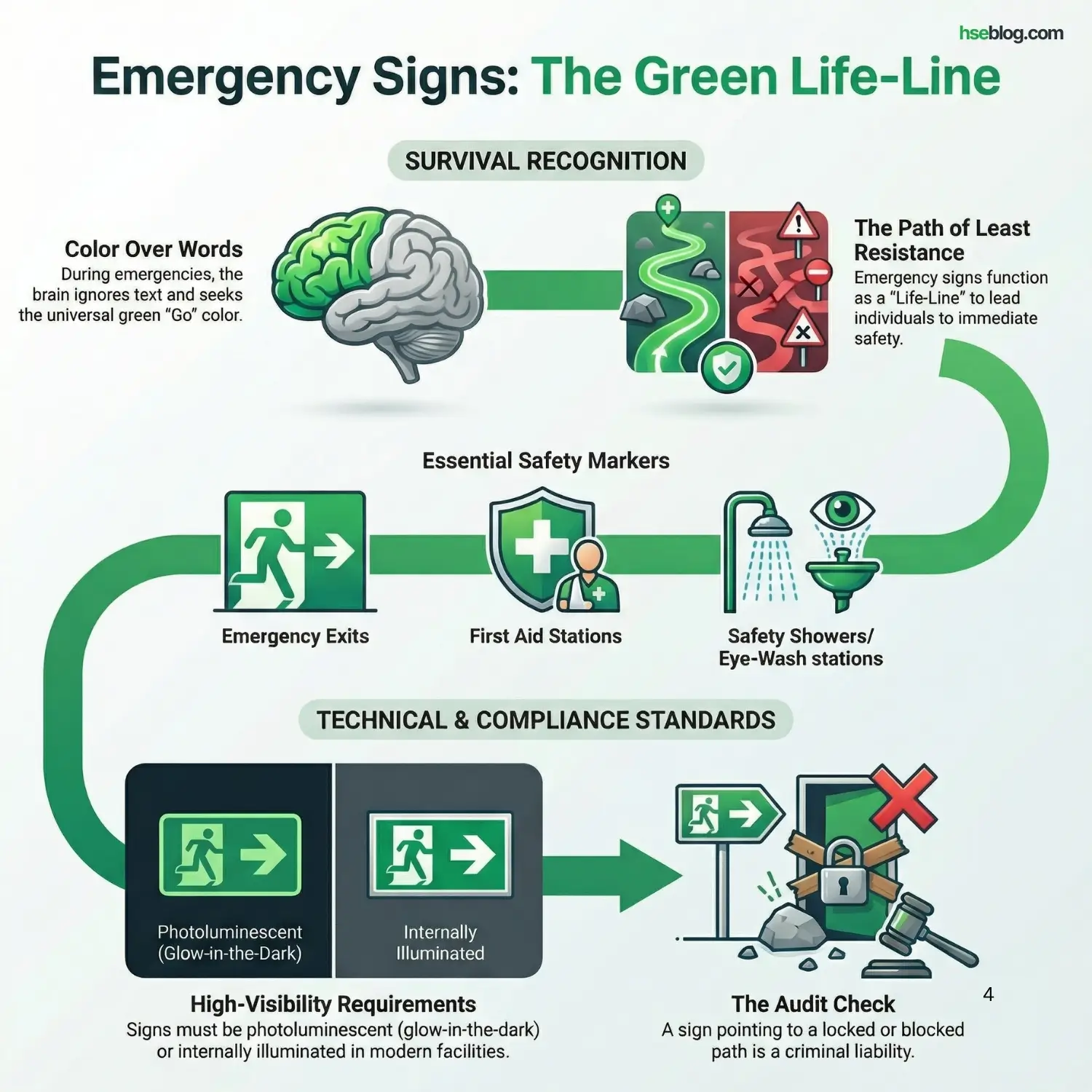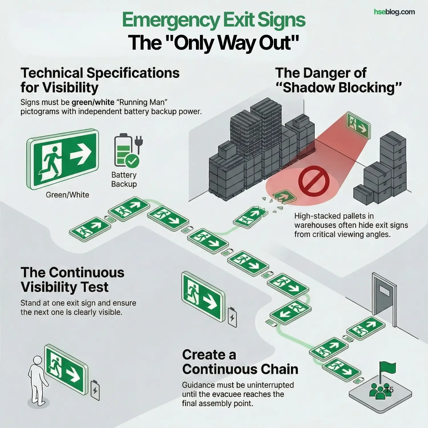 - Audit Check: I always check if an emergency exit sign actually leads to a clear path. A green sign pointing to a locked door or a blocked hallway is a criminal liability for the HSE Manager.