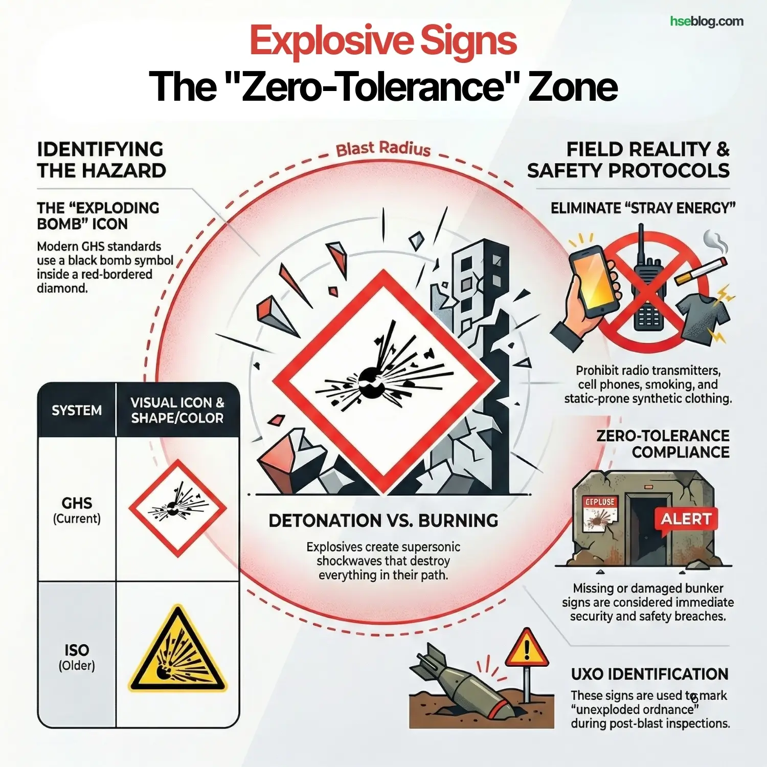 When I’m on a mining site or a demolition project, this sign isn’t just a warning; it defines a “Blast Radius.” It marks materials that don’t just burn—they detonate. A detonation is a supersonic shockwave that destroys everything in its path.