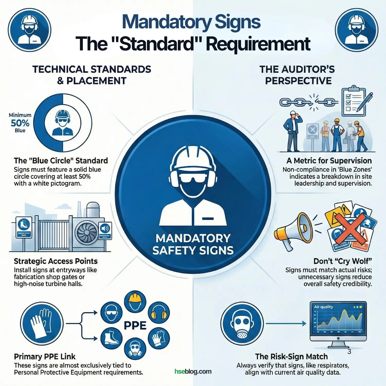 These are my primary audit tools. If I walk into a “Blue Zone” (an area dominated by Blue Mandatory circles), and the workers aren’t following the instructions, it’s a sign of a breakdown in supervision. These signs are almost always tied to Personal Protective Equipment (PPE).