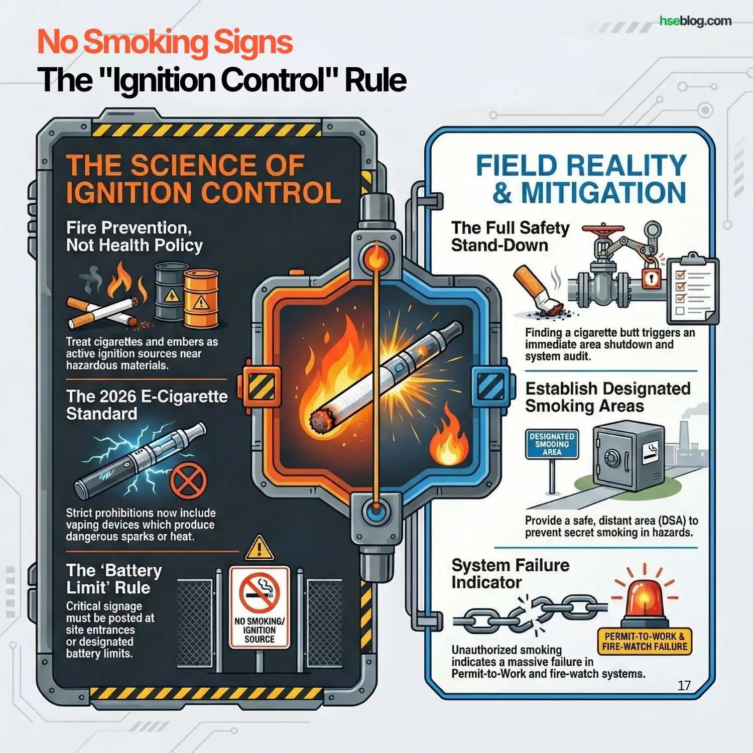 - HSE Insight: Always provide a “Designated Smoking Area” (DSA) far from the hazard. If you don’t give people a safe place to smoke, they will do it secretly in dangerous places.