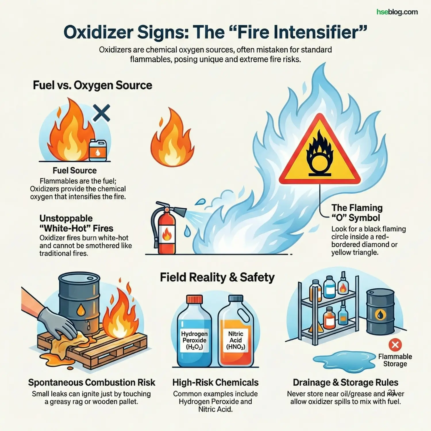 - HSE Insight: When I see this sign, I check the drainage. You cannot allow oxidizer spills to mix with fuels in the same trench.