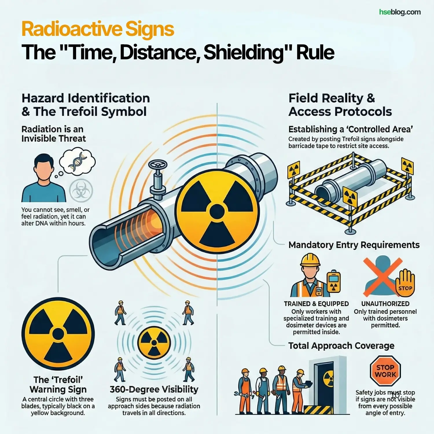 - Field Reality: When this sign is posted alongside “barricade tape,” it creates a “Controlled Area.” Only workers with dosimeters (devices that measure radiation exposure) and specialized training are allowed inside.