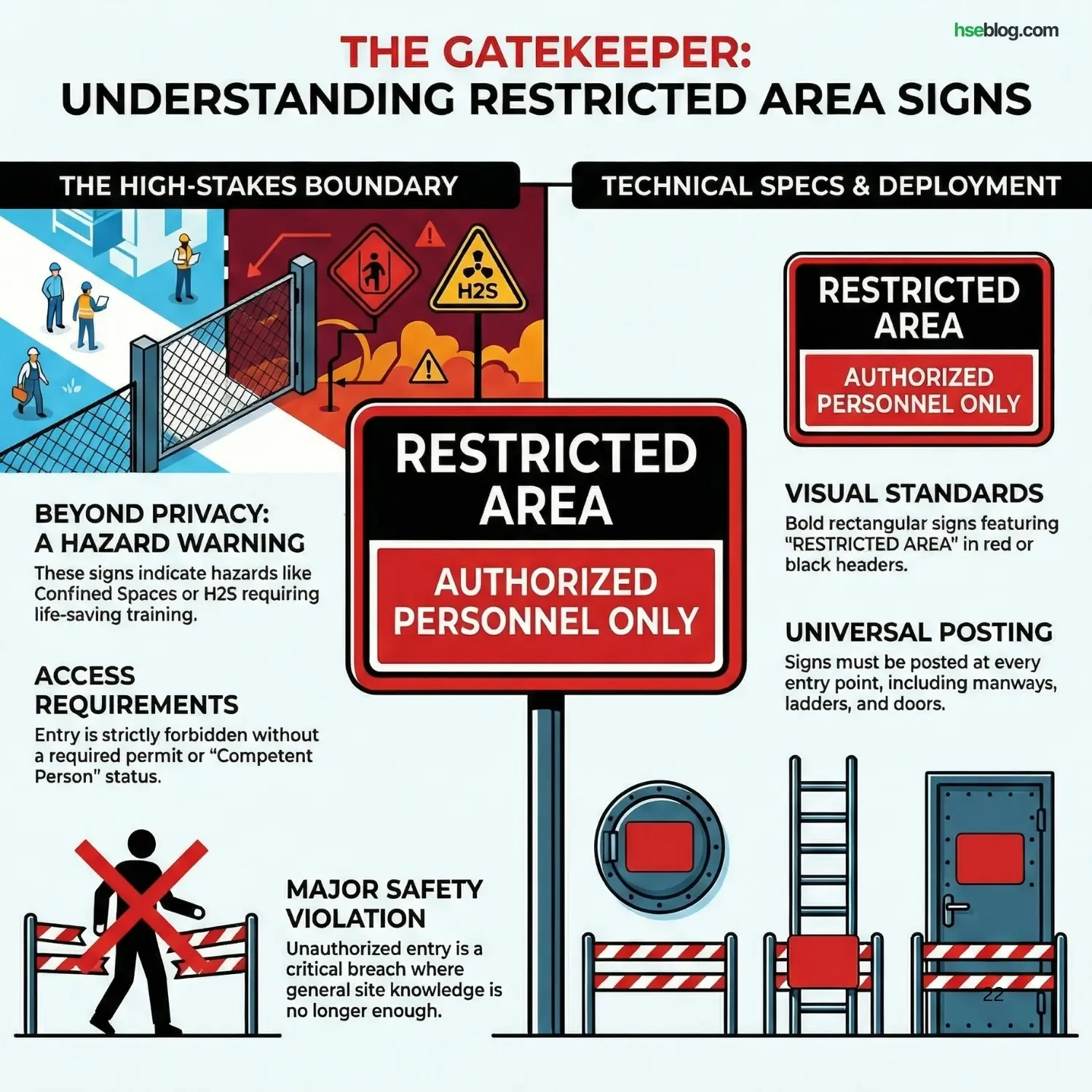 These aren’t just about “privacy.” In the field, a Restricted Area sign usually means there is a hazard inside that requires specific life-saving training to survive—such as Confined Space Entry or H2S awareness.