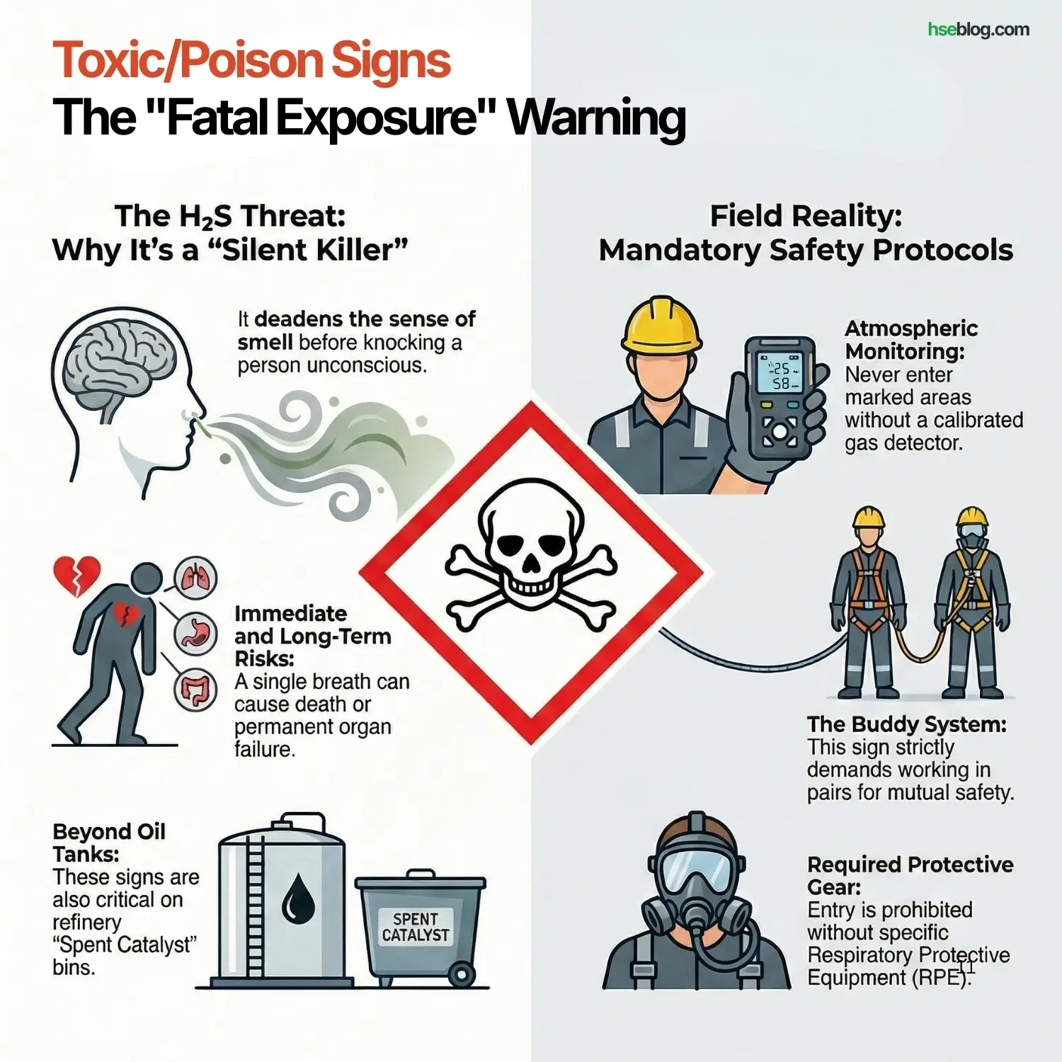 - HSE Insight: I’ve seen these on “Spent Catalyst” bins in refineries. The danger isn’t just immediate death; it’s long-term organ failure. Treat this sign as a “Keep Out” unless you have the specific Respiratory Protective Equipment (RPE) required.