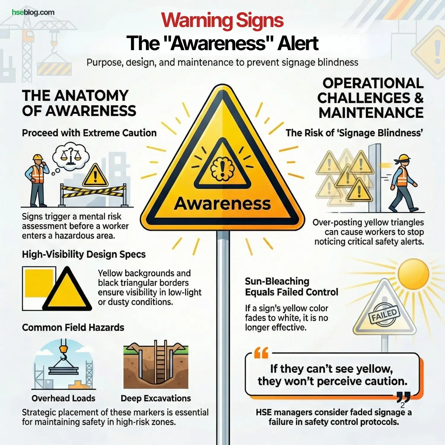 - HSE Insight: As a manager, if I see a warning sign that has been sun-bleached to white, I consider it a failed control. If the worker can’t see the yellow, they won’t perceive the caution.