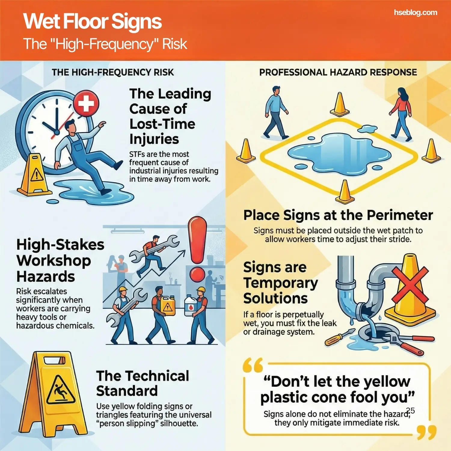 - HSE Insight: I’ve investigated broken hips from slips where the sign was placed after the wet patch. The sign must be placed at the perimeter of the hazard to give the worker time to change their stride.