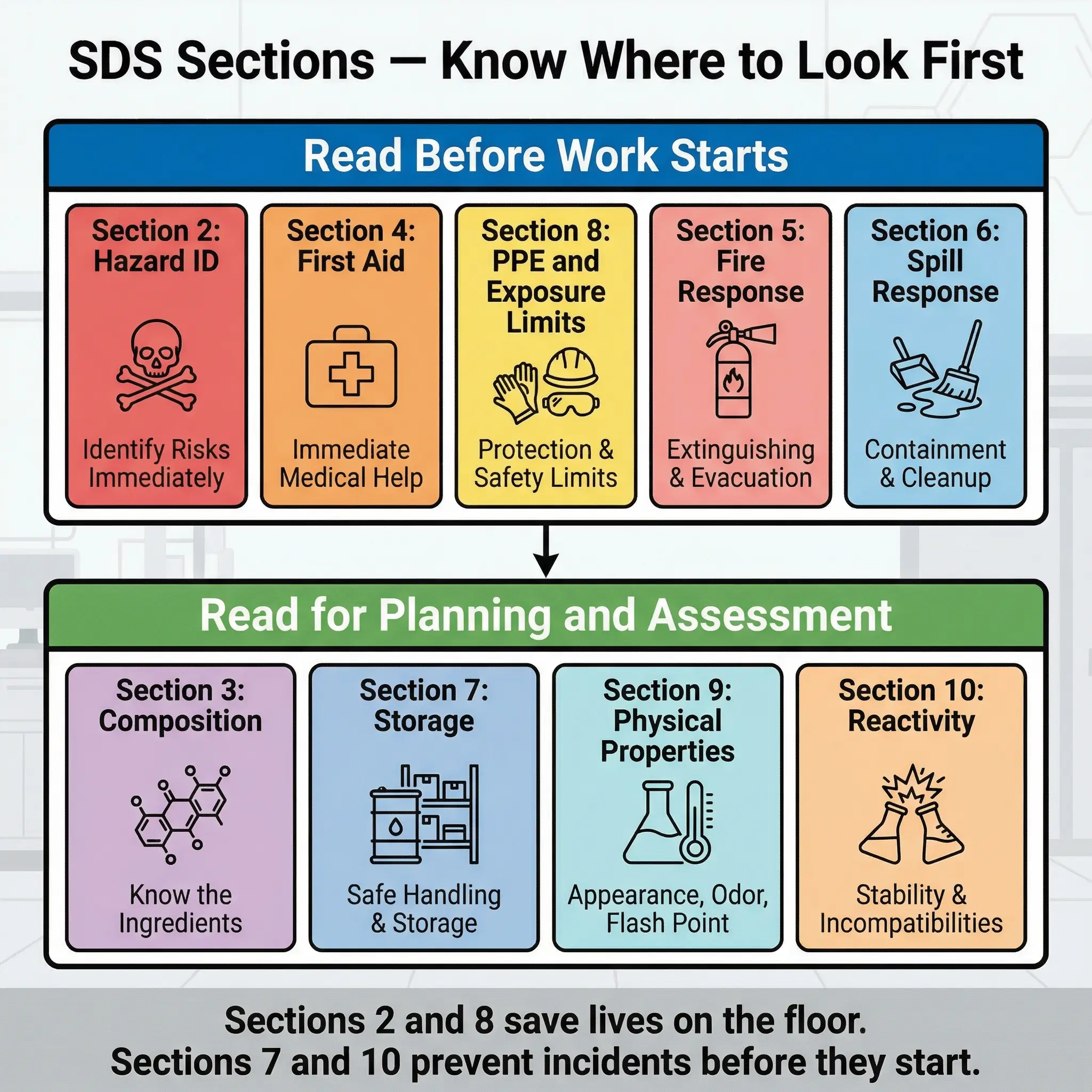 - Section 2 (Hazard Identification) and Section 8 (Exposure Controls/PPE) are your survival sections: If you read nothing else, these two sections tell you what the chemical can do to you and how to protect yourself.