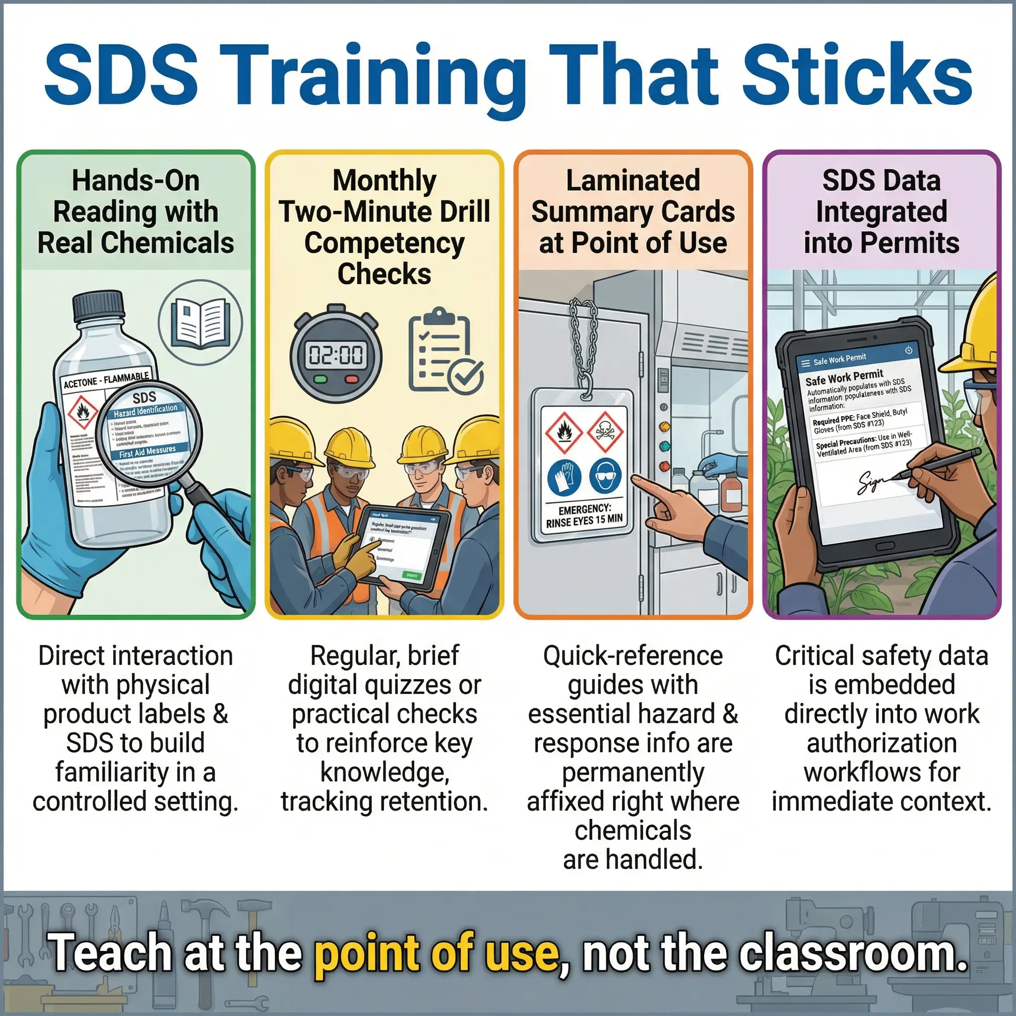 Classroom SDS training where workers sit through a PowerPoint explaining all 16 sections does not work. I have delivered that training myself early in my career and watched the retention disappear within a week. What works is practical, repetitive, task-specific exposure to the document in the context where it matters — at the chemical storage area, at the mixing station, at the point of use.