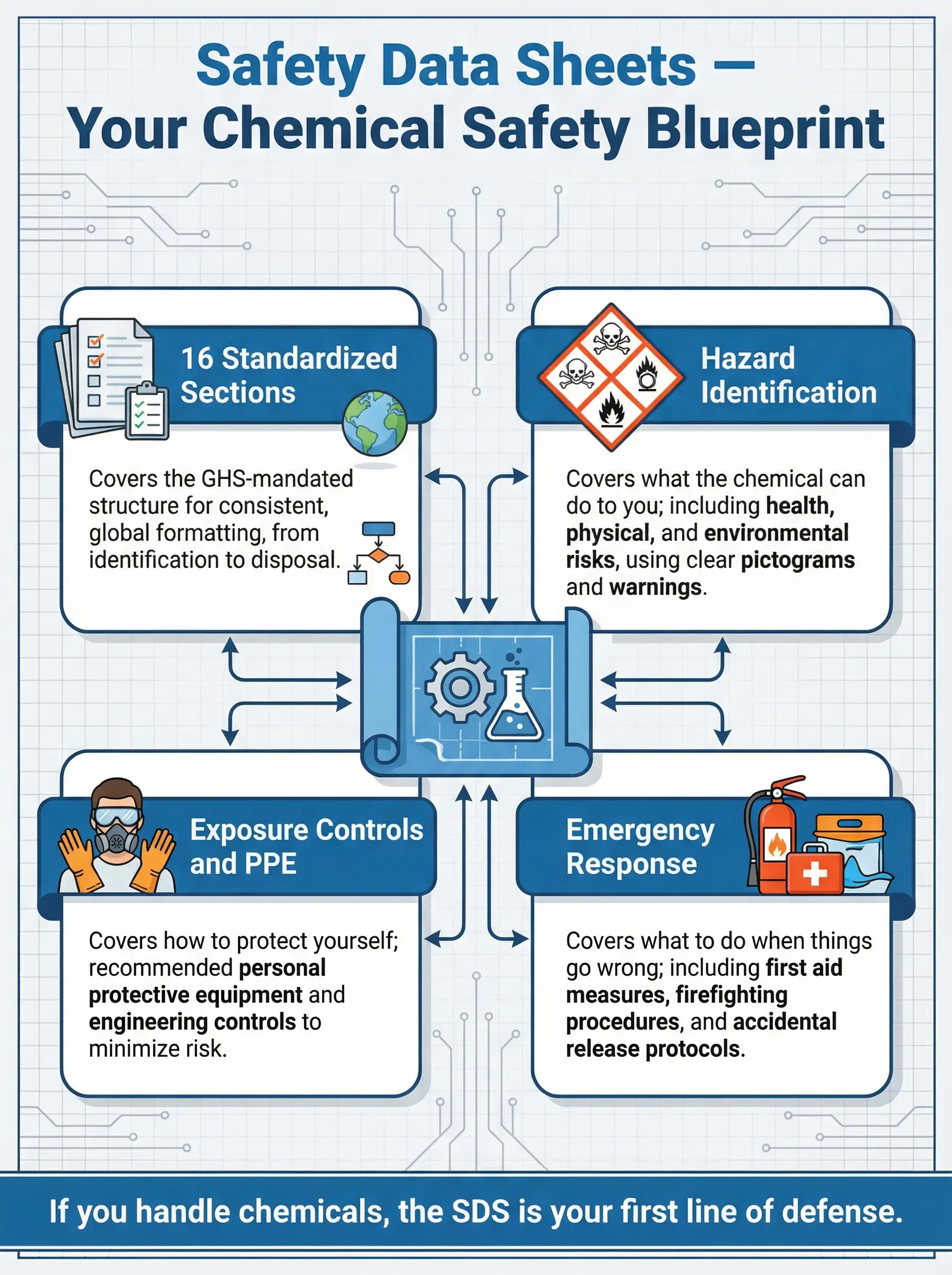 - An SDS is your chemical’s biography: It tells you what a substance can do to your body, how to handle it safely, what PPE to wear, and what to do if things go wrong — all in a standardized 16-section format mandated by GHS.
