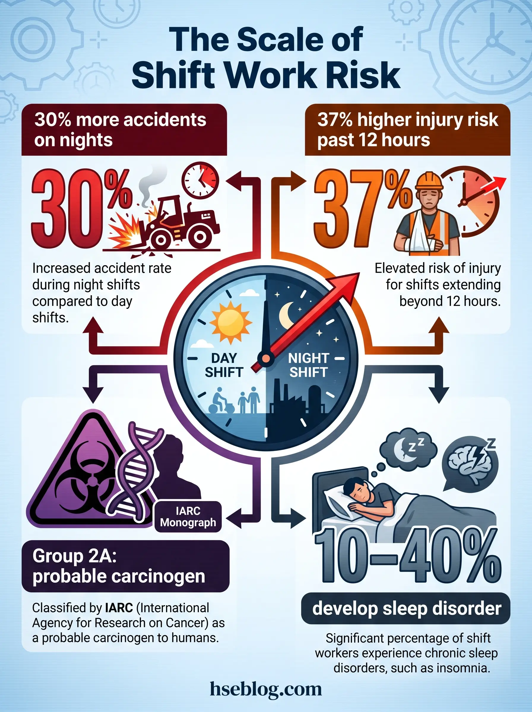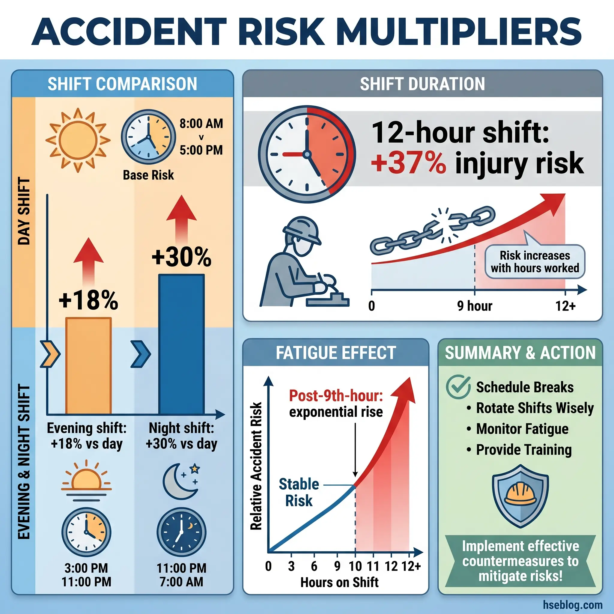 Health risks accumulate over years. Safety risks fire within a single shift — and the curve is steep. The OSHA synthesis of international shift-work epidemiology, at osha.gov/worker-fatigue, puts accident and injury rates 18% higher on evening shifts and 30% higher on night shifts compared with day shifts. Injury risk rises roughly 37% on 12-hour shifts, with the steepest climb after the ninth hour on task. Risk compounds across consecutive nights: the fourth night of a block is demonstrably worse than the first.