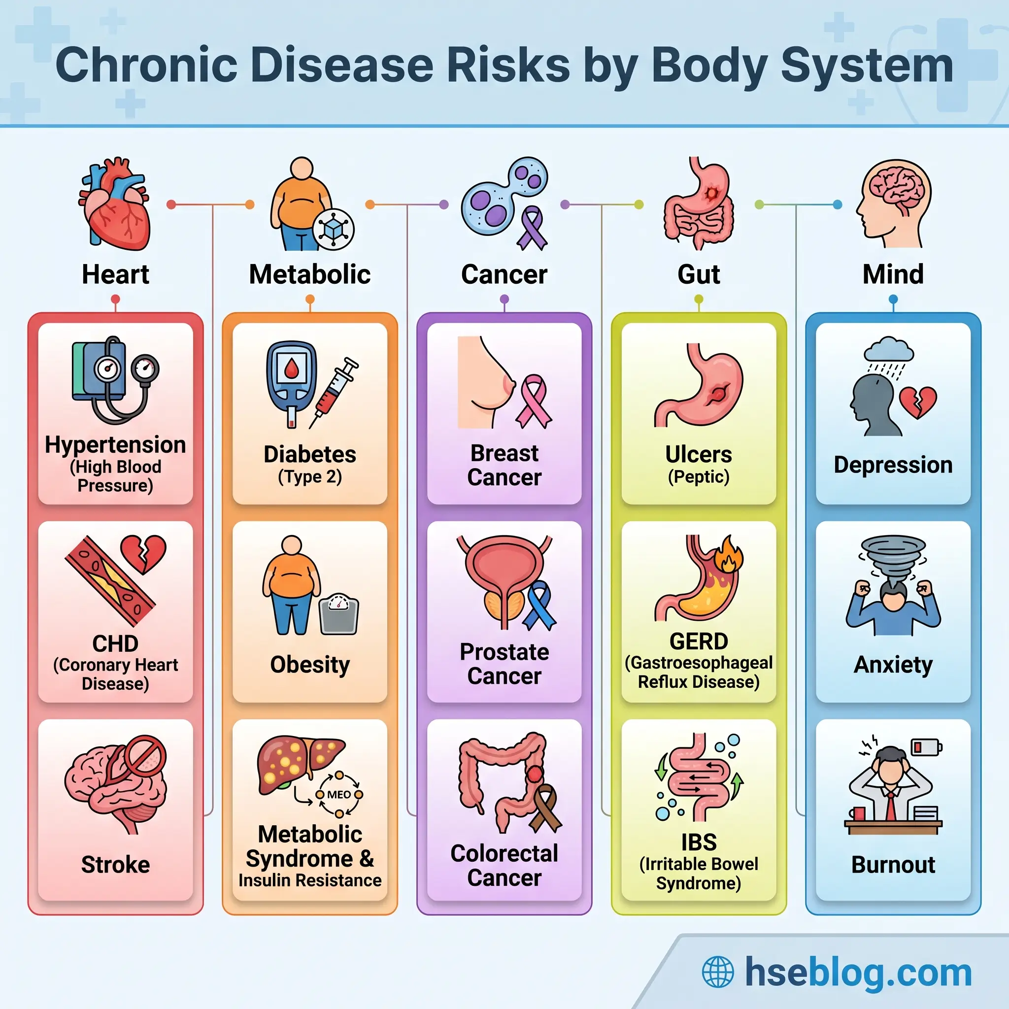 Shift work is independently associated with hypertension, coronary heart disease, and ischaemic stroke. The likely mechanisms include chronic sympathetic activation, disrupted blood-pressure dipping during daytime sleep, and metabolic knock-on effects from circadian misalignment. Metabolic effects — obesity, type 2 diabetes, dyslipidaemia, metabolic syndrome — show the clearest dose-response relationship with years of night work, and they cluster in workers who combine shift work with inactivity and poor-quality eating windows.