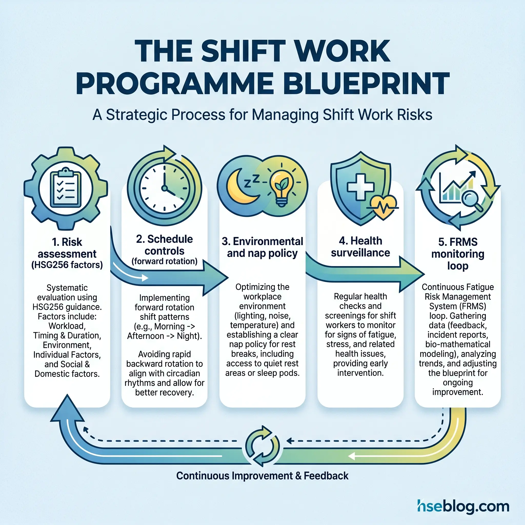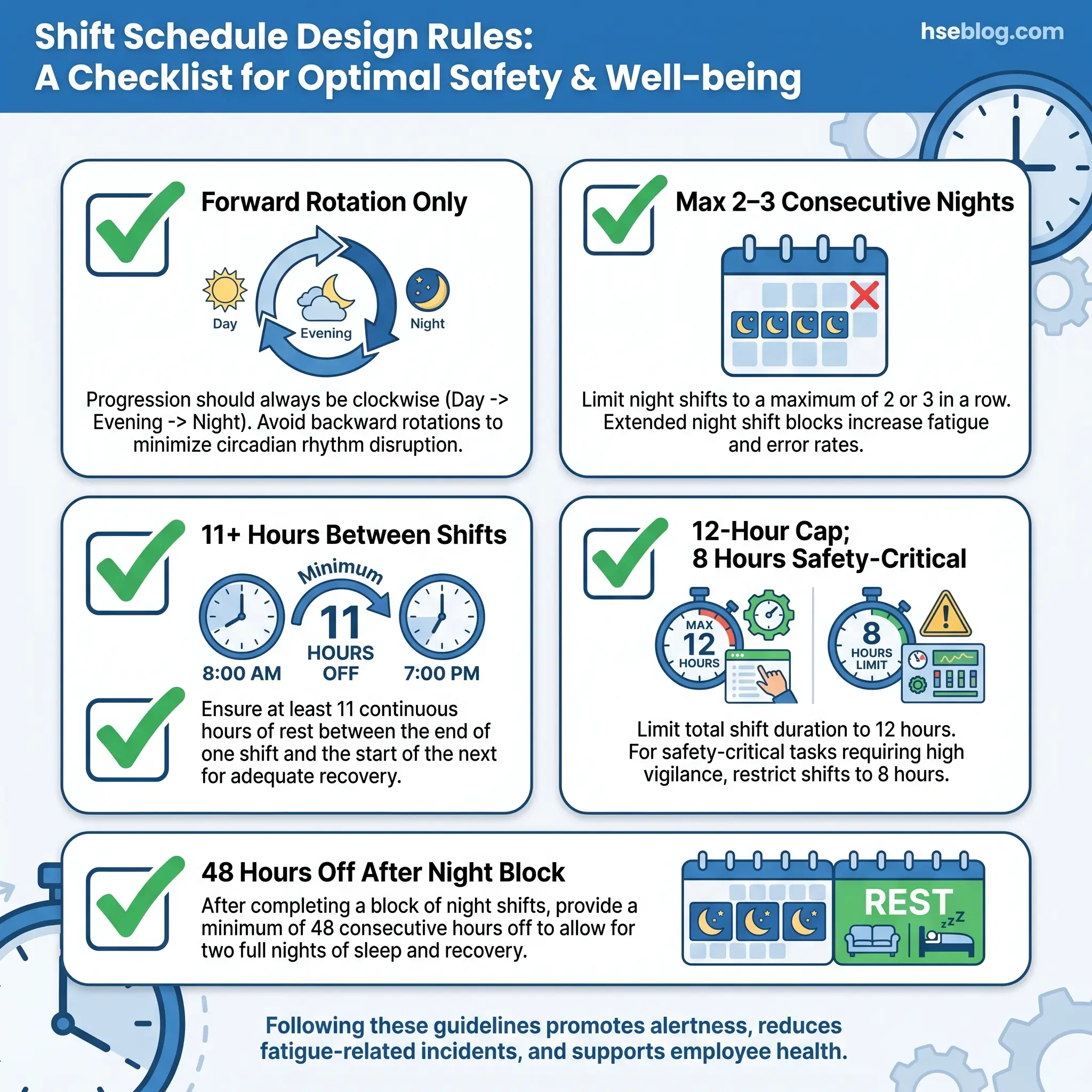 The headline schedule rules, drawn from HSG256 good practice and the NIOSH scheduling guidance at cdc.gov/niosh, are consistent across the evidence base: