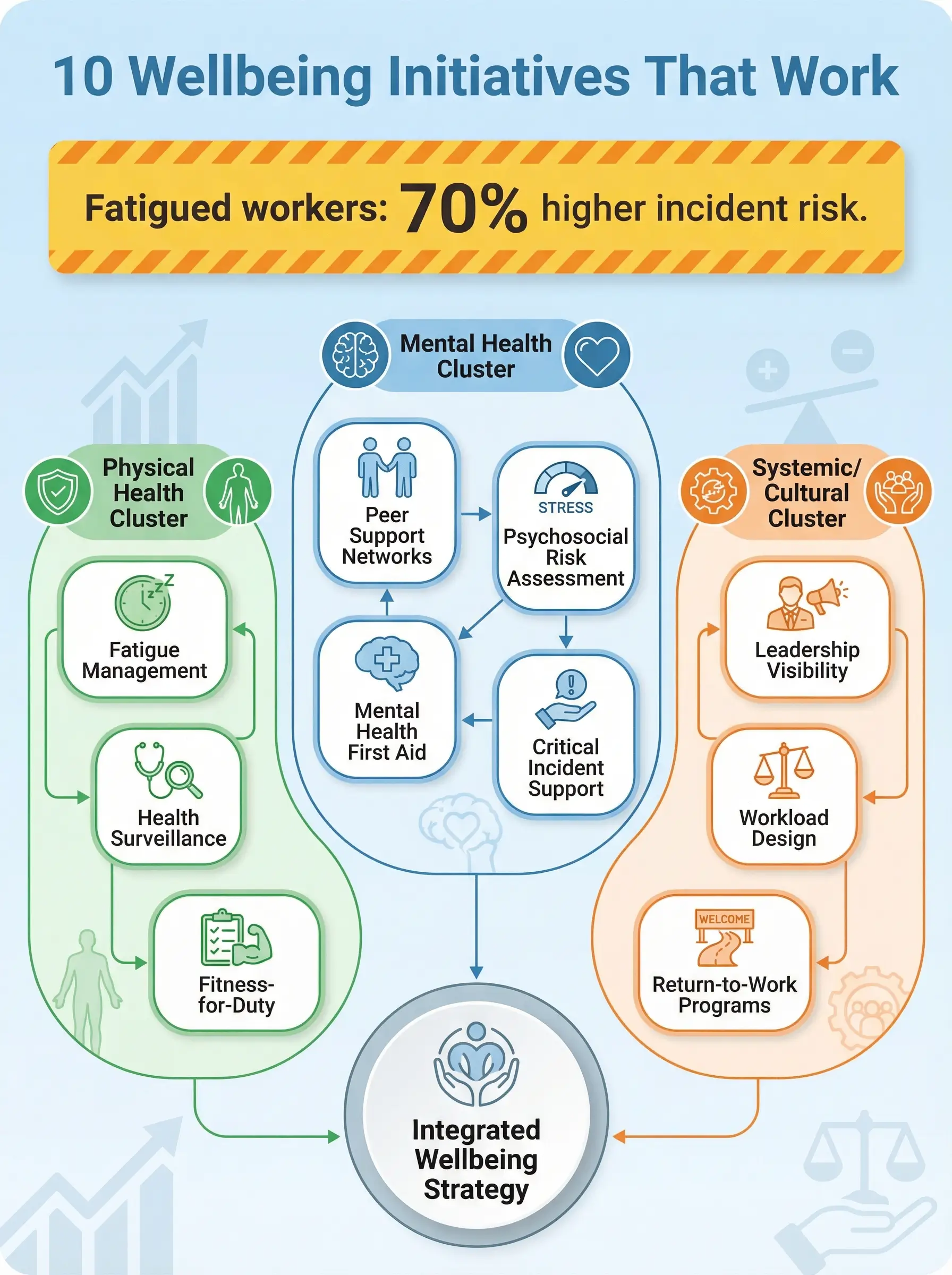 That project became a turning point for how I approach occupational health and safety management. Workplace wellbeing initiatives are not an HR luxury or a feel-good corporate add-on. They are operational controls — and when they are missing, people get hurt. The data backs this up consistently: fatigued workers are 70% more likely to be involved in a workplace incident, and sites with unmanaged psychosocial risks see injury rates two to three times higher than comparable operations with active wellbeing programs. This article covers ten workplace wellbeing initiatives that I have seen work — not in theory, not in a wellness brochure, but on active construction sites, offshore platforms, refinery turnarounds, and mining operations where the consequences of getting it wrong are measured in stitches, fractures, and fatalities.