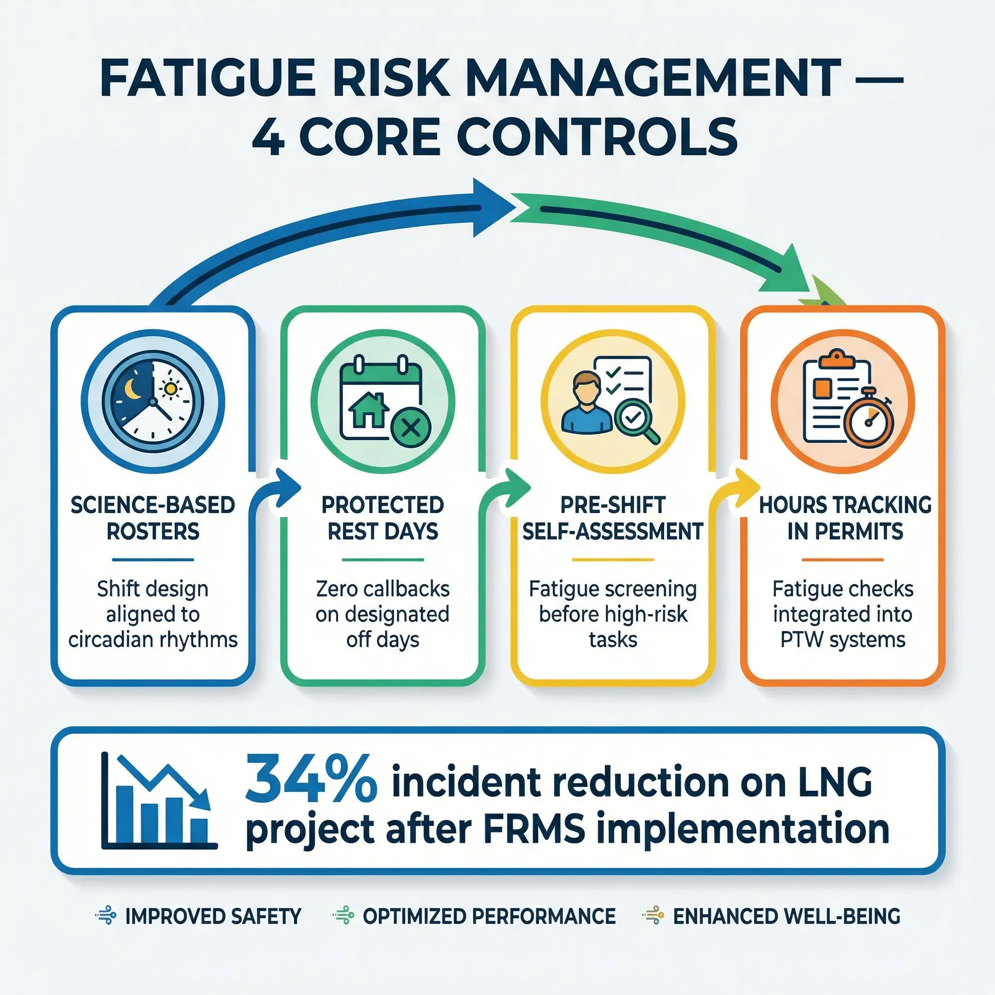 Pro Tip: The biggest resistance to FRMS comes from operations managers who see rest-day enforcement as a productivity loss. Present it as a risk control with incident cost data. On one LNG project, implementing a proper FRMS reduced recordable incidents by 34% in the first year — the productivity “loss” from enforced rest was recovered three times over in reduced incident costs and avoided schedule disruption.