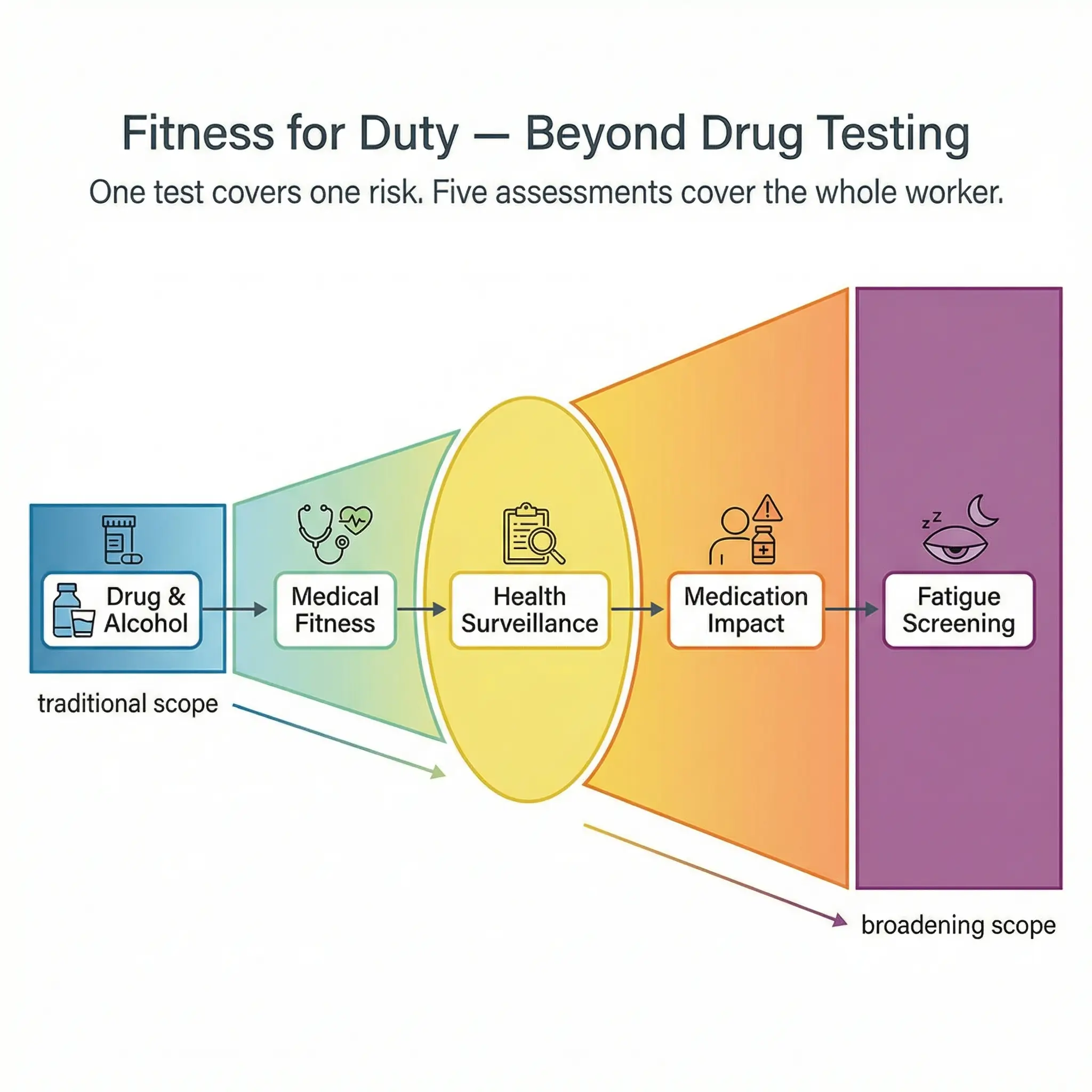 Most fitness-for-duty programs in heavy industry begin and end with drug and alcohol testing. That is one narrow slice of fitness for duty. A worker can pass a urinalysis and still be completely unfit to operate a crane, work at height, or enter a confined space because they slept three hours, are managing an uncontrolled medical condition, or are taking prescription medication that impairs reaction time.