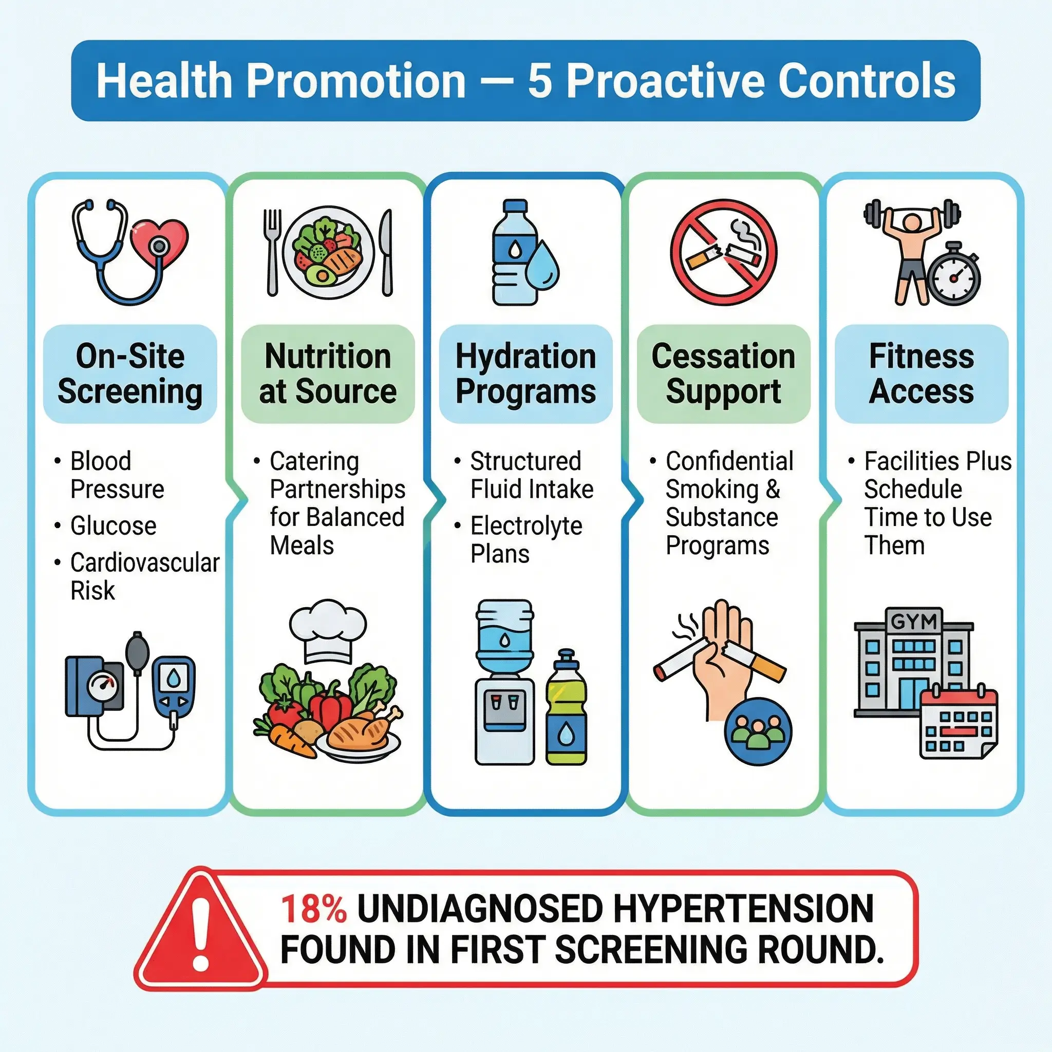 The final initiative addresses a gap that most safety-focused organizations overlook entirely: the baseline physical health of their workforce. Occupational health surveillance catches work-related exposures, but it does nothing for the cardiovascular disease, diabetes, hypertension, and metabolic conditions that are prevalent in industrial workforces — and that directly affect fitness for duty, fatigue resilience, and incident risk.